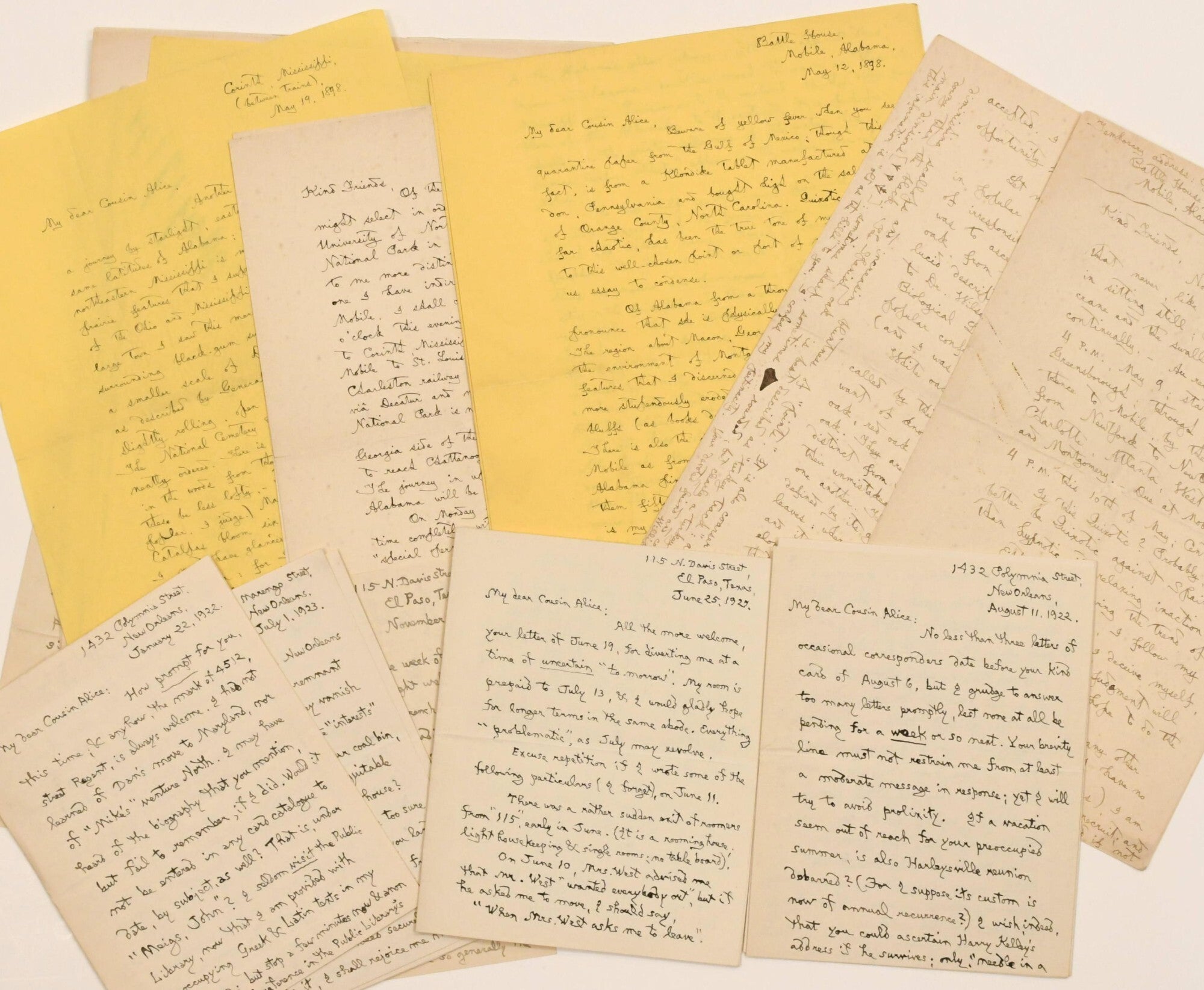 William L. Price, of Leesport, PA, wrote numerous long, lively narratives about his travels to his "cousin Alice", an unknown figure. A lifelong bachelor from a wealthy Quaker family, he traveled alone as a boarder. His letters offer an outstanding observational portrait of a quiet, learned man forging his way through life with little plan. ~~The first 10 letters date to 1898 and introduce William as a former Yale professor who followed his intuition to Mobile, Alabama to enlist in the army. A Quaker by birth, William is nevertheless determined to fight in the Spanish American War, despite being too old and frail. He obtains a clerk position under quartermaster Lt. Wiley at Camp Thomas in Chickamauga, GA. He writes Cousin Alice from camp before traveling to Arroyo, Puerto Rico in August. Of interest are his vivid descriptions of camp life, impressions of the island, and the people around him. ~~After a long pause, the letters resume in 1915 and continue through 1927 and continue to be substantial, descriptive, and optimistic in tone. Teaching when employed, he maintains his financially insecure but simple lifestyle, moving frequently. Prominent themes include a passionate regard for nature, literature, and an intolerance of cold weather. This collection presents the interesting and affectionate correspondence of a man gifted with language, discussing his gentle life to a beloved lifelong friend. The paper varies; the penmanship is legible and visibly ages with him; all letters in very good condition with some fold lines and occasional minor tears/losses.~~.