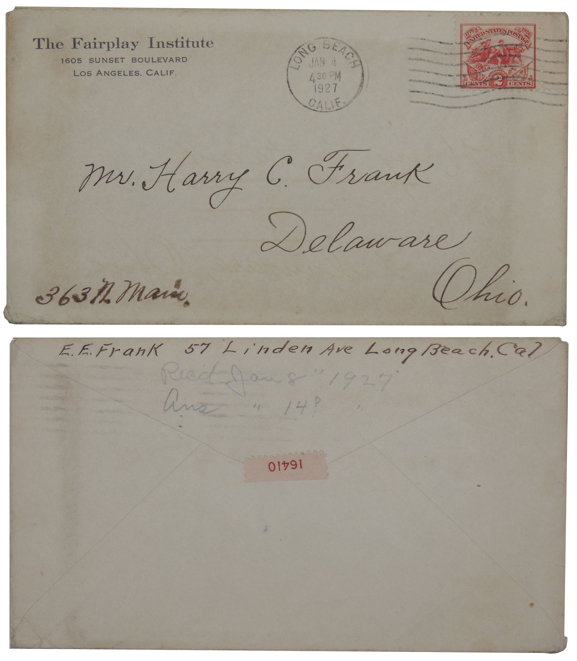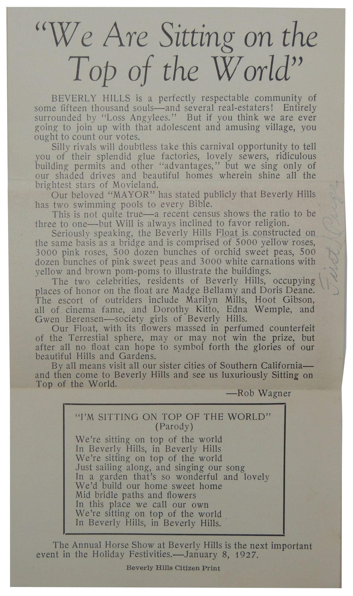 Add to basketOne-page leaflet/broadside, 5" x 9" folded for mailing.With original mailing envelope from "The Fairplay Institute," Los Angeles. Postmarked Jan. 4, 1927. Addressed to Harry C. Frank, Delaware, Ohio. Apparently issued to accompany the Beverly Hills "float" that won First Prize in the Rose Parade of 1927. Wagner humorously describes "shaded drives and beautiful homes wherein shine all the brightest stars of Movieland," with "two swimming pools to every bible," minus the "glue factories, lovely sewers, ridiculous building permits and other advantages " of the surrounding "Loss Angylees." Wagner (1872-1942) was a left-leaning former newspaper artist who, upon moving to Los Angeles, began to write about the burgeoning film industry for the Saturday Evening Post. He wrote and directed films in Hollywood, became friends with Douglas Fairbanks, Mary Pickford, Will Rogers, Upton Sinclair, and Charlie Chaplin (he was also his publicist). In 1929, Wagner founded his own literary magazine, Script, a liberal publication containing interviews and film criticism with contributors including Dalton Trumbo, Walt Disney, and Ray Bradbury. A rare ephemeral imprint.