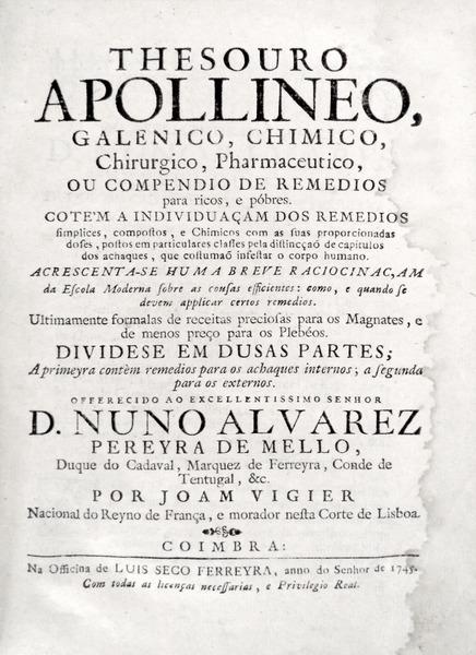 OU COMPENDIO DE REMEDIOS para ricos, e pobres . COTE?M A INDIVIDUAÇAM DOS REMEDIOS símplices, compostos, e Chimicos com as suas proporcionadas doses, postos em particulares classes pela distinçaõ de capítulos dos achaques, que costumaõ infestar o corpo humano. ACRESCENTA-SE HUMA BREVE RACIOCINAC,AM da Escola Moderna sobre as cousas eficientes: como, e quando se devem applicar certos remedios. Ultimamente formalas [fórmulas] de receitas preciosas para os Magnates, e de menos preço para os Plebéos. DIVIDESE EM DUSAS [DUAS] PARTES; A primeira contèm remedios para os achaques internos; a segunda para os externos. OFFERECIDO AO EXCELLENTISSIMO SENHOR D. NUNO ALVAREZ PEREYRA DE MELLO, Duque do Cadaval, Marquez de Ferreyra, Conde de Tentugal. &c. POR JOAM VIGIER Nacional do Reyno de França, e morador nesta Corte de Lisboa. COIMBRA: Na Officina de LUIS SECO FERREYRA, ano do Senhor de 1745. In 8º (20,5x15 cm) com [28], 518 págs. Encadernação da época inteira de pele com rótulo vermelho, nervos e ferros a ouro por casas fechadas na lombada. Exemplar com título de posse na folha de guarda: ?Fr. Lourenço da Encarnação? Com manchas de humidade nas orlas e dianteiras das folhas iniciais. Vestígios de trabalho de traça na lombada. Obra dividida em duas partes. A primeira com os medicamentos utilizados para uso interno e a segunda com a descrição dos medicamentos para uso externo. Apresenta formulários de elementos simples e compostos para fabrico desses medicamentos. Conforme o próprio autor declara no prólogo, uma das razões que o levou a escrever este livro foi o facto de, aparentemente, não haver disponível um compêndio médico escrito em português acessível a todas as classes. João Vigier põe de lado, expressamente, a opinião atribuída a Hipócrates de que os purgativos actuam atraindo a si o humor que lhes é semelhante. Do seu receituário fazem parte a bebida febrífuga de Crollius, o antihectico de Poterius, a água antiepiléptica e o elixir vitae de Quercetano, a tintura cephalica de Senerti, a água melancólica de N. Lémery e outras variadas preparações de muitos outros filósofos químicos modernos. João [Jean] Vigier (1662-1723), de origem francesa, mudou-se para Portugal no início do século XVIII e estabeleceu-se como médico (físico) e farmacêutico (droguista) em Lisboa. Além deste 'Thesouro Apollineo, Galenico, Chimico, Chirurgico, Pharmaceutico', publicou também a Histoire des plantes de l"Europe (1718), uma obra que revela os conhecimentos deste autor sobre as plantas nativas do Brasil, e aponta para o grau de disseminação das plantas e saberes encontrados nas matas e florestas da América portuguesa, apesar de não existirem indícios sobre a sua passagem por terras brasileiras. In 8º (20.5x15 cm) with [28], 518 pp. Binding: Contemporary full calf, red label, raised bands and guilt tools on frames on spine. Ownership title on half title page: ?Fr. Lourenço da Encarnação? Damp stains around the edges of the initial folios. Slight book worming on spine. This work is divided in two parts, the first with all the medicines used externally and the second with those for internal use. It presents formulas of simple and composed elements to produce those medicines. As the author himself declares in the Prologue, one of the reasons that lead him to write this books was the fact that, apparently, a medical compendium written in Portuguese wasn"t available for all social classes. João [Jean] Vigier (1662-1723), was born in France and moved to Portugal in the beginning of the 18th century, establishing himself as a physician and pharmaceutical in Lisbon. Besides this work, he also published the 'Histoire des plantes de l"Europe (1718)', a work that reveals the knowledge of this author on the native plants of Brazil and it refers the spread of the plants in the woods and forests of the Portuguese America, although there is no information on him ever going to Brazil. Inocêncio IV, 52: ?JOÃO VIGIER, de nação francês, e nessa qualidade excluído por Barb.