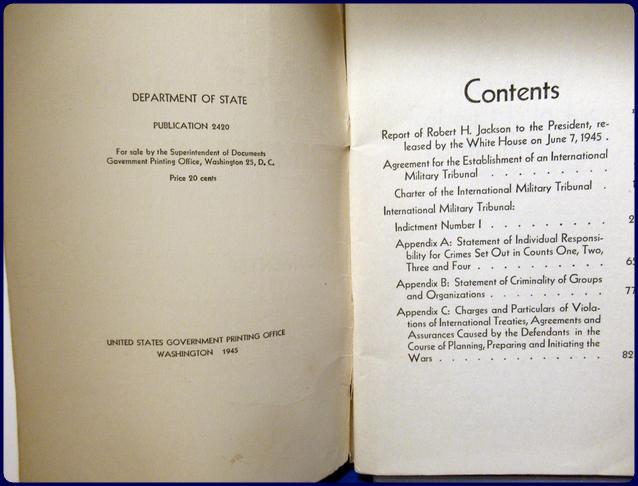 TRIAL OF WAR CRIMINALS. DOCUMENTS: 1. Report of Robert H. Jackson to the President. 2. Agreement Establishing an International Military Tribunal. 3. Indictment. (Department of State Publication 2420)