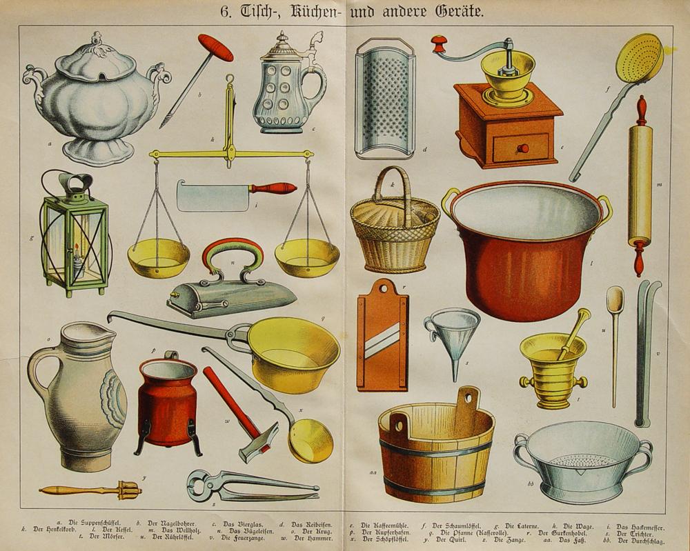 "Tisch-, Küchen- und andere Geräte" originale Farb-Lithographie/colour lithograph ca./approx.27x36cm (Darstellung/image size) auf Kunstdruck-Papier/paper (31x38cm) oberhalb der Darstellung typographisch betitelt; J. F. Schreiber Esslingen&München um 1890