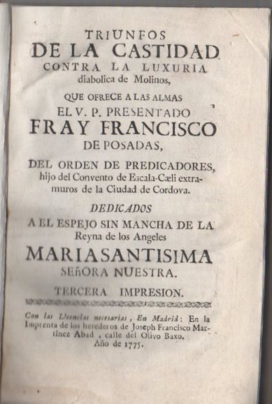Pergamino. Condition: Bien. TRIUNFOS DE LA CASTIDAD CONTRA LA LUXURIA DIABOLICA DE MOLINOS, QUE OFRECE A LAS ALMAS EL V. P. PRESENTADO FRAY FRANCISCO DE POSADAS. Publicación: Madrid, En la Imprenta de los herederos de Joseph Francisco Martínez, Calle del Olivo Baxo. 1775. 4º menor (20 cm). Portada, 9 hojas, 578 páginas. Encuadernación pergamino de época. Conservación: Buen estado, con guardas fatigadas y lomo parte superior dañado como se ve en imagen. Soberbio ejemplar. Para el envío de los libros preferimos utilizar papel reciclado y sobres fabricados con materiales que provienen de fuentes responsables Nos enfocamos en dar un servicio personalizado, ágil y de calidad a nuestros clientes, dando respuestas rápidas y velocidad en los envíos. Le agradecemos de antemano su visita, y recuerde que ? El regalo de un libro, además de obsequio, es un delicado elogio. Seller Inventory # 20210813cc2003