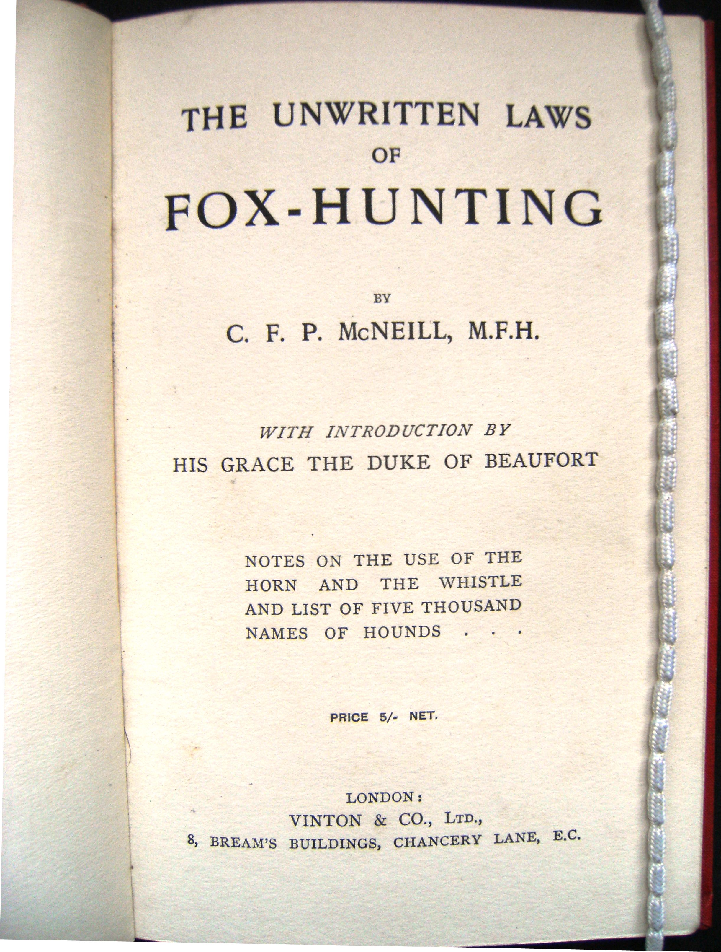 THE UNWRITTEN LAWS OF FOX-HUNTING . Notes of the Use of the Horn and the Whistle and List of Five Thousand Names of Hounds