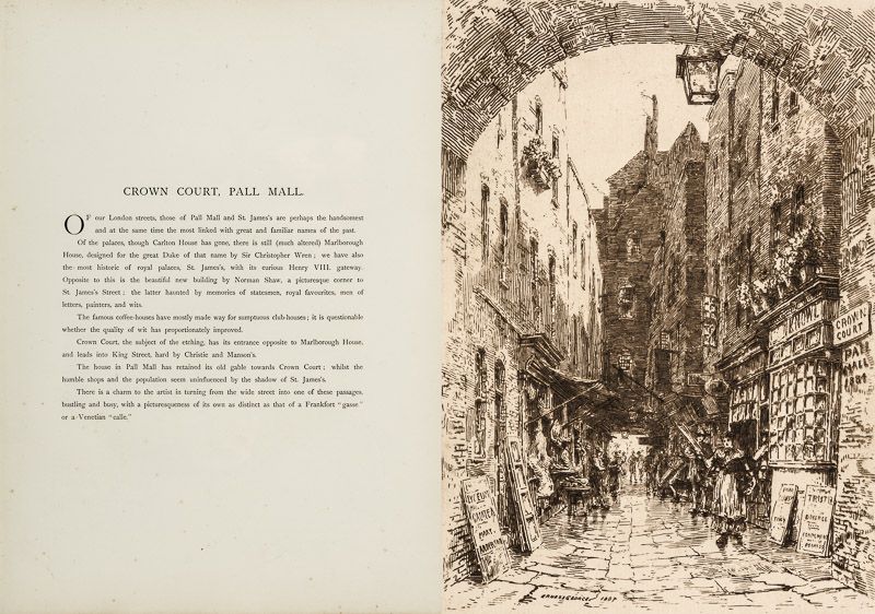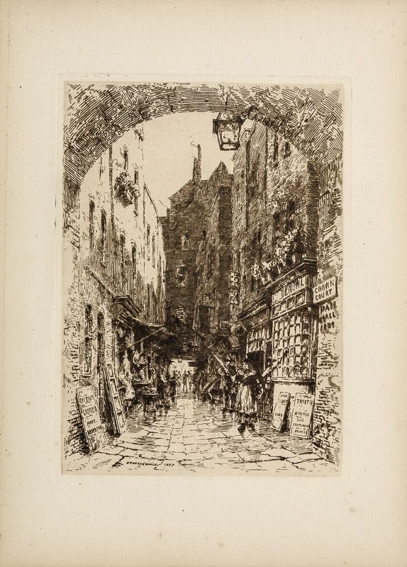 Add to basketOriginal Etching. 26 cm x 37 cm. Original, vintage etching by Sir Ernest George. Signed in the plate, not in pencil ! Only very faint signs of some foxing. Mounted, ready to be framed. With descriptive Letterpress by Ernest George (included is a wonderful historic explanation regarding this old location in London by Ernest George). Sir Ernest George RA (13 Jun 1839 1922) was an English architect, landscape and architectural watercolour painter, and etcher. His London office was once called "The Eton of architects' offices". His pupils included Herbert Baker, Guy Dawber, John Bradshaw Gass, Edwin Lutyens and Ethel Charles. In the 1870s in partnership with Harold Peto, George designed houses in London for the Cadogan Estate in Chelsea and Kensington, and a number of country houses. In 1881 they designed Stoodleigh Court at Tiverton for Thomas Carew. In 1891 they designed an extension to West Dean House for William James, creating the Oak Room, now Oak Hall in West Dean College. Between 1870 and 1911 George designed several houses with his former pupil, Alfred B. Yeates. In New Zealand, which he never visited, he designed the Theomin family house Olveston in Dunedin which was built 1904-07. He was also responsible for the current Southwark Bridge (1921), and the Memorial to Heroic Self Sacrifice in London's Postman's Park. He served as president of the Royal Institute of British Architects from 1908 to 1910. In the late 19th century, George trained Ethel Charles, the first woman to be elected a member of the Royal Institute of British Architects. George's residence at 17 Bartholomew St, London Borough of Southwark is commemorated with a Southwark Council blue plaque. (Wikipedia) Sprache: english.