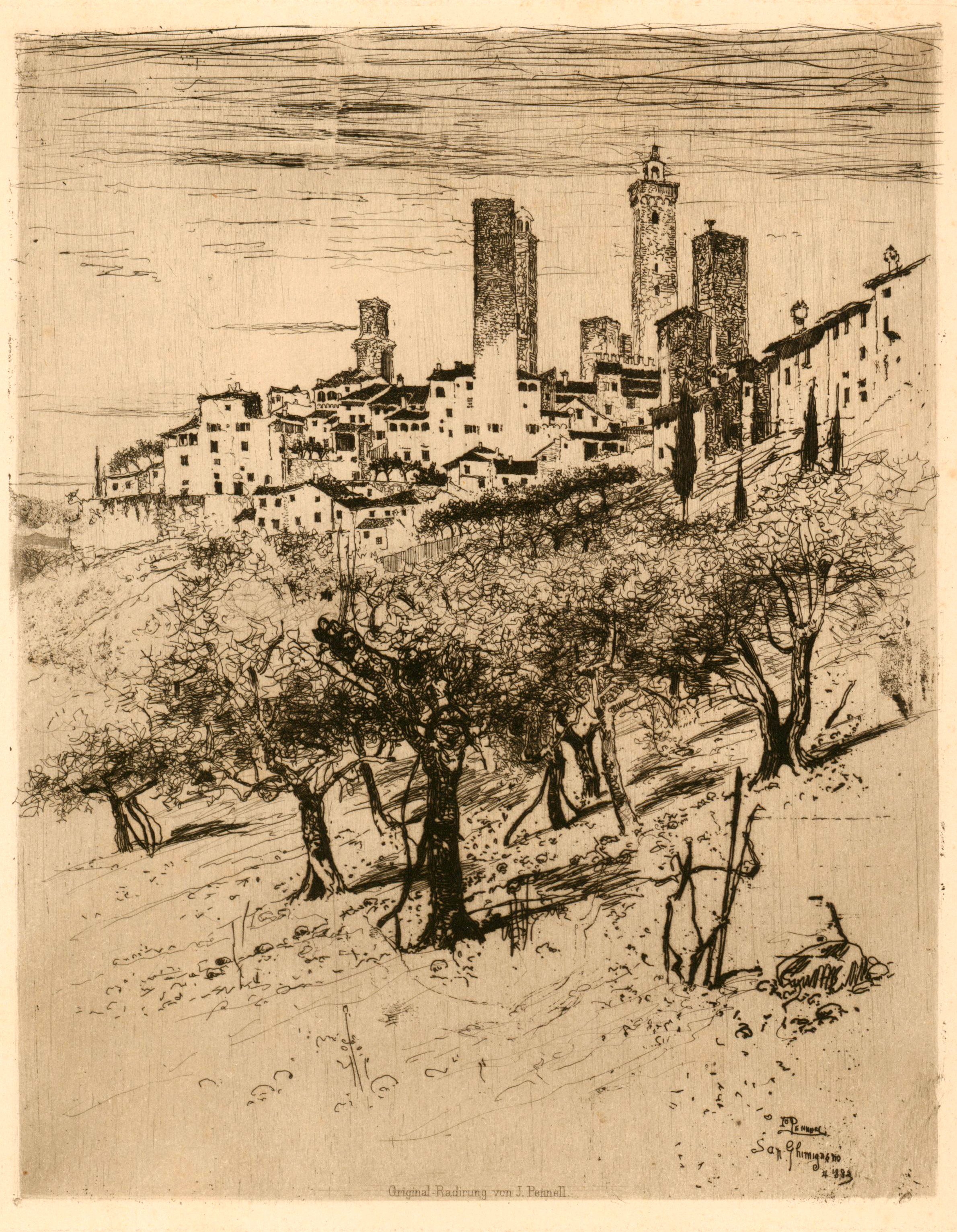 Add to basketRadierung v. J. Pennell, 1893, 25,6 x 20,3 (H) vgl. Wuerth 52. - Ansicht mit den Türmen der Stadt und Olivenbäumen im Vordergrund. - Rechts in der Platte bezeichnet, signiert und datiert. Unten Mitte typographisch: Original Radirung von J. Penell. Wohl in der Gesellschaft für vervielfätigende Kunst in Wien gedruckt. - Sehr schönes Blatt mit viel Plattenton und 1 cm Rand.