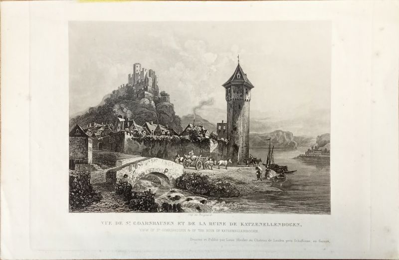 St. Goarshausen - Vue de St. Goarshausen et de la Ruine de Katzenellenbogen. View of St. Goarshausen and of the Ruin of Katzenellenbogen. Aquatinta nach L. Bleuler aus: Zschokke: Voyage pittoresque des bords du Rhin.