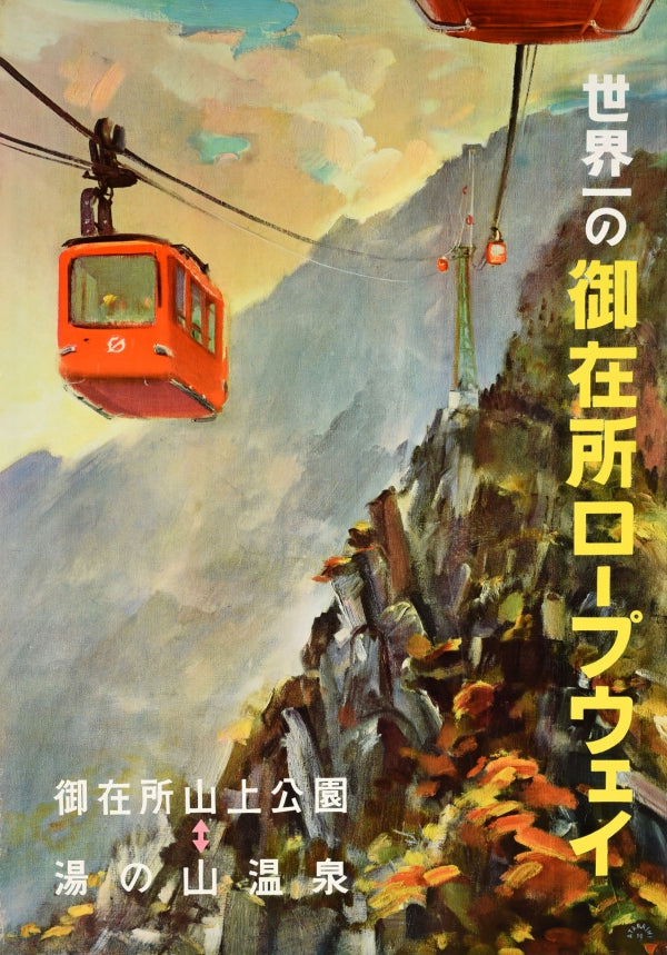 Add to basketOriginal vintage Asia travel poster for the Gozaisho Ropeway å¾¡å æ ã ã ¼ã 㠦㠧㠤 in Japan featuring people in red cable car cabins travelling up and down the mountain with the colourful forest below. Opened in 1959, the Mount Gozaisho Ropeway is a Japanese aerial lift line; the area is popular for its scenery with views of Yokkaichi city and Ise Bay and the Yunoyama Onsen hot springs resort in the Suzuka Quasi-National Park. Good condition, restored creasing, restored tears, gloss finish, backed on linen. Size: 75x53cm.