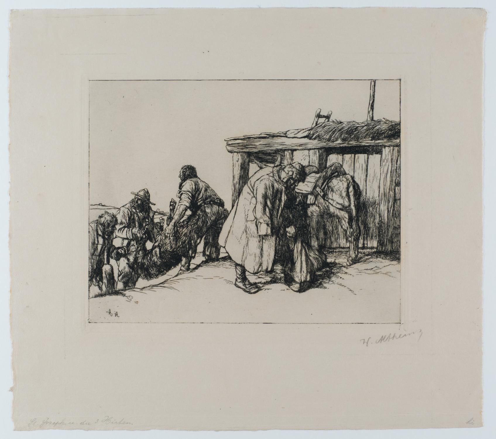 Radierung, 1912, auf cremefarbenem Japan, signiert. 23,8:29,8 cm. - Im unteren breiten Rand horizontale Knickfalte. Literatur: Klipstein 21 b (von c). Gedruckt bei Wetteroth in München. Als Sohn eines griesgrämigen Schneiders und einer gehörlosen Mutter war Altheim vermutlich früh motiviert, sich durch Zeichnungen zu verständigen und auszudrücken. Er flüchtete gerne zu den Tieren in der bäuerlichen Umgebung und zeichnete schon als Kind bevorzugt Pferde. Zum Glück erkannte der Fabrikant Wolf seine Begabung, förderte ihn und ermöglichte ihm ein Studium an der Städelschen. Angebote der Schule für Stipendien in Paris und Italien nahm er kaum wahr, die Fremde lockte ihn nicht. Von den verschiedenen Entwicklungen in der Malerei seiner Zeit blieb er unbeeindruckt. Seine Vorliebe galt früh den realistischen Tierdarstellungen, später lag der Schwerpunkt seiner Motive im bäuerlichen Milieu, auch religiöse Darstellungen kamen dazu. 1897 zog er mit seiner Frau Marie Teichmann nach Eschersheim in die Lindenstraße 5, heute Lindenring. Dort wurden Sohn Franz und Tochter Marie geboren. Im eigenen Anwesen hielt der Maler mehrere Hunde, Esel und zeitweise sogar einen Bären. Der Ring zum Anketten ist heute noch vorhanden. Mit Vorliebe ritt er auf seinem Esel oder Maultier durch den Ort, auch nach Frankfurt, oft stattete er das Tier auffällig mit Strohhut aus und sich selbst mit geladenem Colt. Es soll auch vorgekommen sein, dass er bis zur Theke ritt. Mit seinen Bildern hatte er in diesen Jahren guten Erfolg, er konnte vom Malen leben. Das könnte ein Grund dafür sein, dass es kaum Altheim-Bilder öffentlich zugänglich zu sehen gibt. Waffen gehörten immer zu seinen besonderen Vorlieben. Er pflegte sie penibel und studierte sie als Modelle. Ohne geladenen Revolver ging er kaum aus dem Haus, er war in Eschersheim berüchtigt deswegen. Im Wirtshaus traf er die einfachen Menschen, die er nach den Anforderungen in der Kunstschule bevorzugt malte. Dort gelang es ihm, künstlerische Studien zu Papier zu bringen. Es entstanden solche und auch Karikaturen zu den Themen Apfelwein, Rauscher, Wein, Bier, Betrunkene. Seine Modelle waren Bauern, Hausierer, Fuhrknechte, Vagabunden und Stromer. Altheims Gesamtwerk besteht aus großen Ölgemälden, kunstvoll realistisch gemalt, ohne volkstümliche Manier, sondern mit persönlichem Bezug und Blick, keiner Mode oder Strömung verpflichtet, oft düster gehalten, zudem aus Zeichnungen und Radierungen. Nach seiner Entfremdung von der Familie und der Scheidung lebte er noch zwei Jahre sehr bescheiden in Rödelheim. Er meldete sich 1914 zum Militär, wurde aber abgewiesen, Dienst im Lazarett probierte er, hielt sie aber nicht aus. Am ersten Weihnachtstag 1914 nahm er sich mit einer Kugel selbst das Leben.