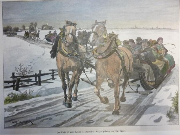 Holzstich Bayern bei München - Zur Kirche fahrende Bauern in Oberbaiern. Orig.-Zeichnung von Chr. Speyer.