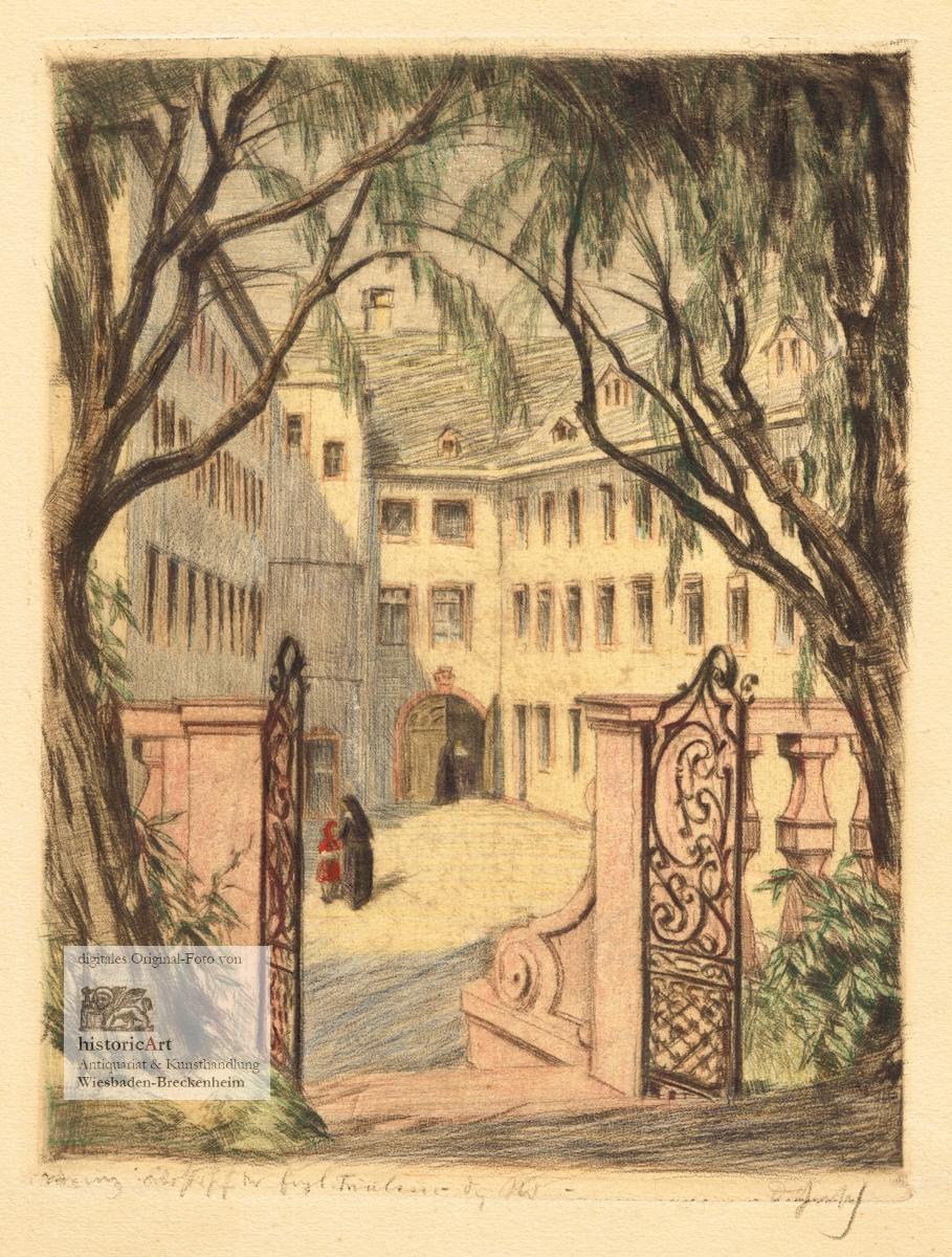 Mainz. Hoff der Engl(ischen) Fräulein. Blick in den Schulhof der Englischen Fräulein des Congregatio Jesu Ordens in Mainz. Original-Radierung von Leonhard Diefenbach um 1870