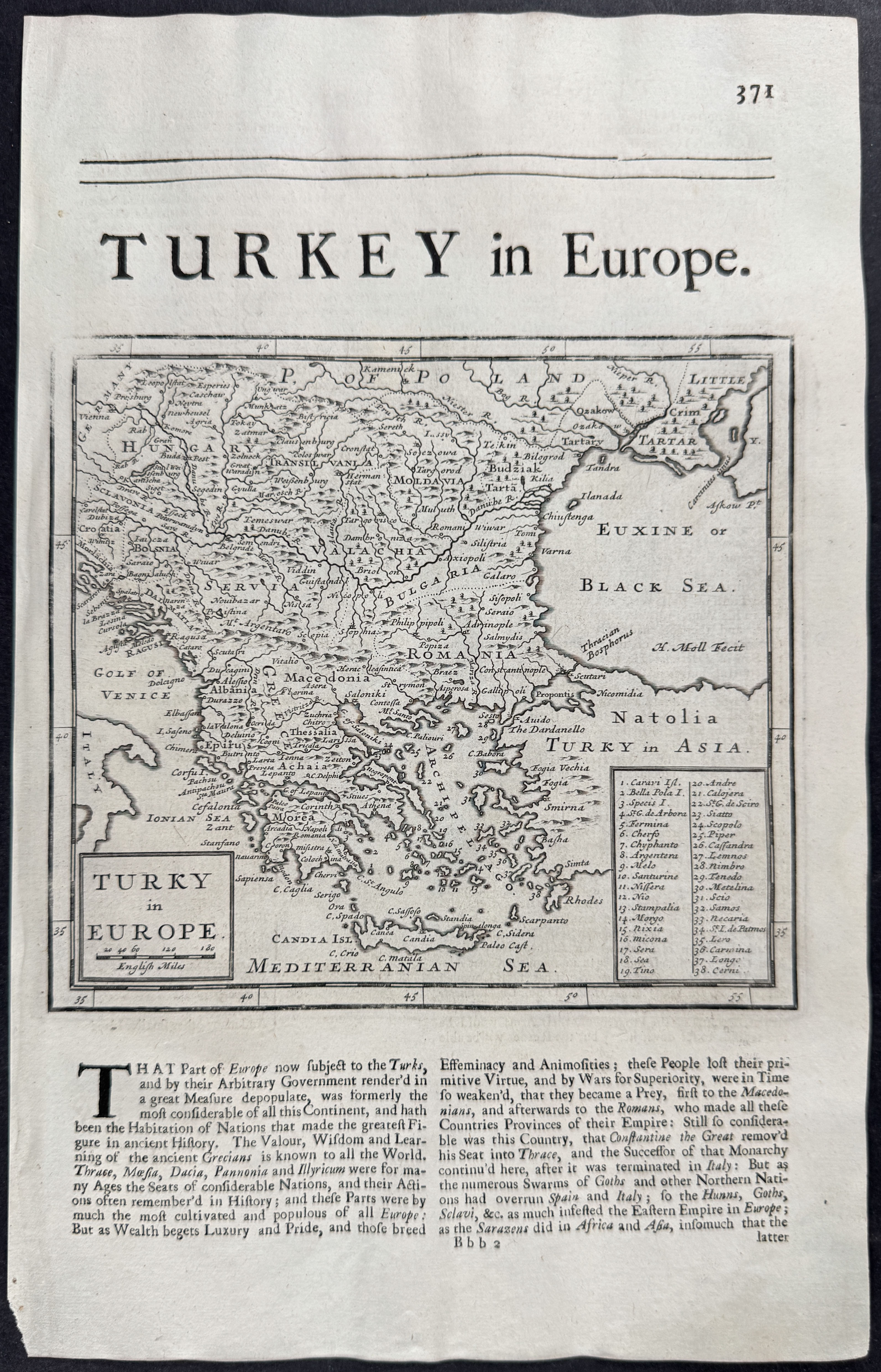 Add to basketThis engraved map is from Herman Moll's "The Compleat Geographer: or, The Chorography and Topography of all the Known Parts of the Earth." This is from the fourth edition of the work published in 1723 in London for J. Knapton. --- Herman Moll (1654-1732) was a skilled cartographer and publisher based in London and Holland. He got his start as an engraver for Moses Pitt and other London map publishers. Moll is said to have made the bold claim that without a doubt â California is an Island.â He was contemporaries with Robert Boyle, Robert Hooke, and William Dampier. --- The work is in very good to excellent condition overall. There may be some faint offset or bleed through from nature of the plates and printing to each side of paper There may be a few minor marks or imperfections to be expected with age. Please review the image carefully for condition and contact us with any questions. --- Paper Size ~ 8 1/2" by 13 1/2".