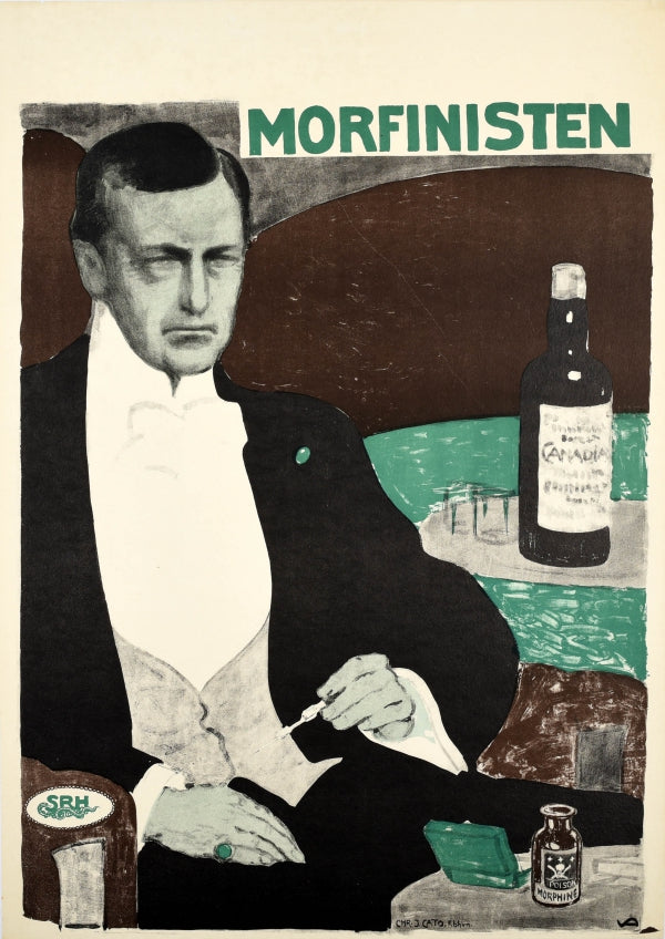 Add to basketOriginal antique movie poster for the 1911 short film The Morphine Takers / Morfinisten directed by Louis von Kohl and starring Lili Beck, Alfred Cohn and Vera Fjelstrup features a well-dressed gentleman drug addict holding a needle with a jar of morphine labelled Poison with a skull and crossbones symbol on it and a bottle of Canadian whisky (?) on the tables. Artwork by Chr J Cato (Kbhyn). Good condition, restored paper losses on top edges, minor staining, backed on linen. Size: 91x65cm.