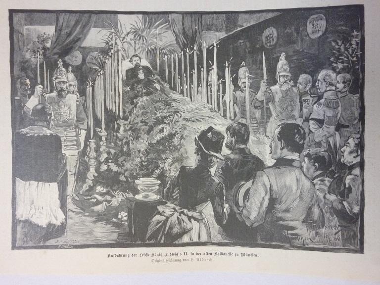 Orig. Holzstich - Bayrisches Königshaus - Aufbahrung der Leiche König Ludwig's II. in der alten Hofkapelle zu München. Originalzeichnung von H. Albrecht.