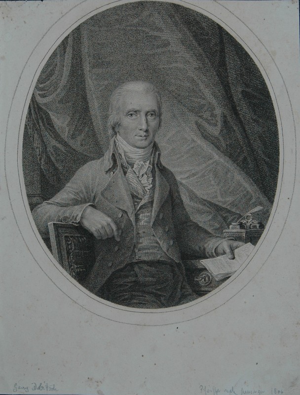 Portrait. Halbfigur an einem Schreibtisch, Hintergrund mit Vorhang. Punktierkupferstich von Pfeiffer nach Kinninger. Abzug vor der Schrift und vor dem Stechernamen.