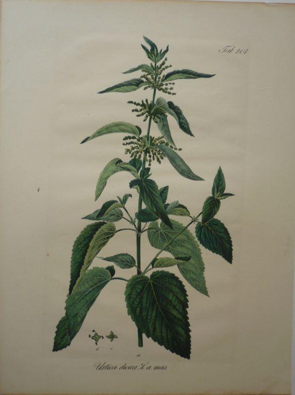 Urtica dioica L. a mas - Große Brennessel. Kol. Lithographie Nr. 201 aus: Wagner, Daniel: Pharmaceutisch-medicinische Botanik.