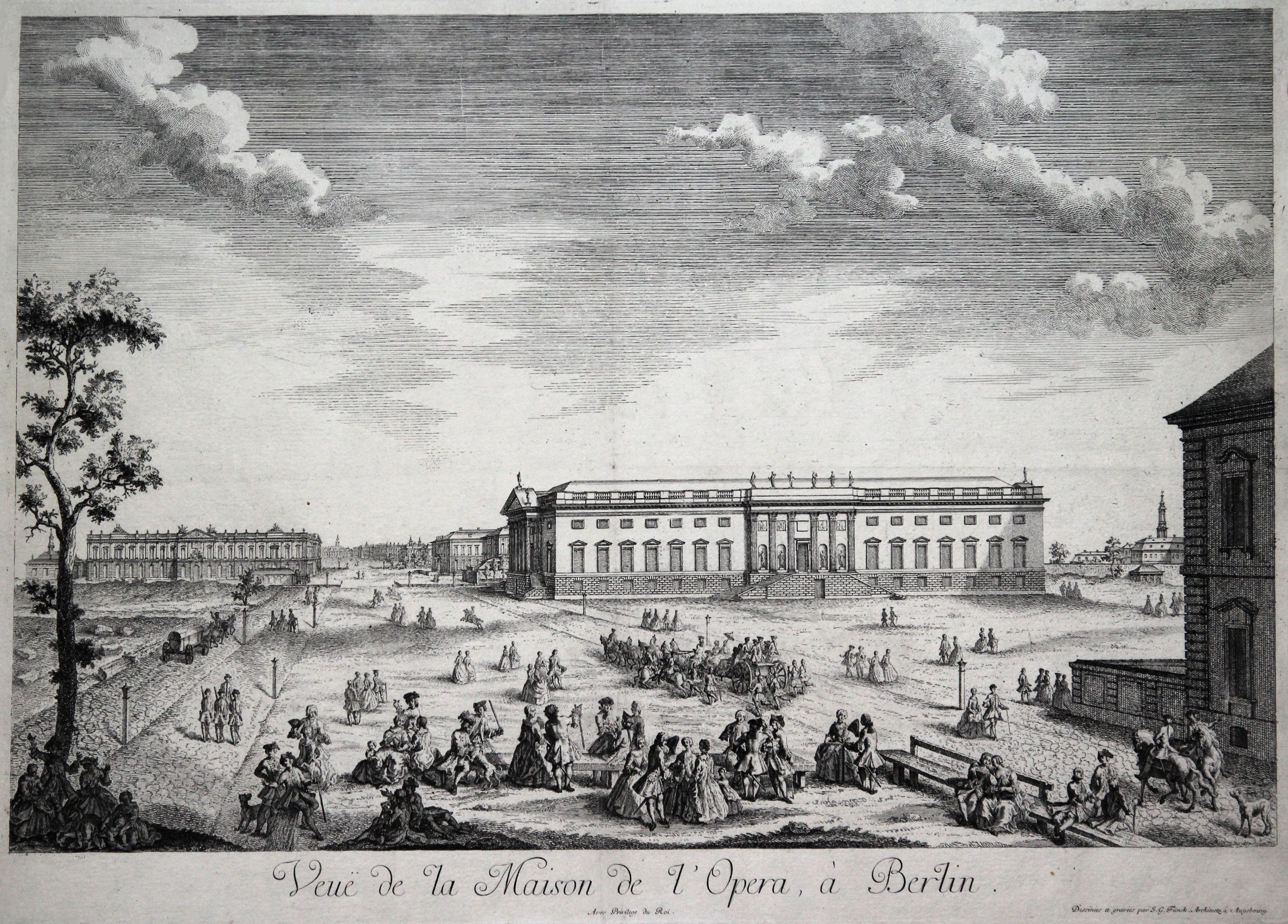 "Vue de la Maison de l' Opera à Berlin" Ansicht ohne die Widmung, "Presenté à Monsieur Le Baron de Knobelsdorf, Sur Indendant General".
