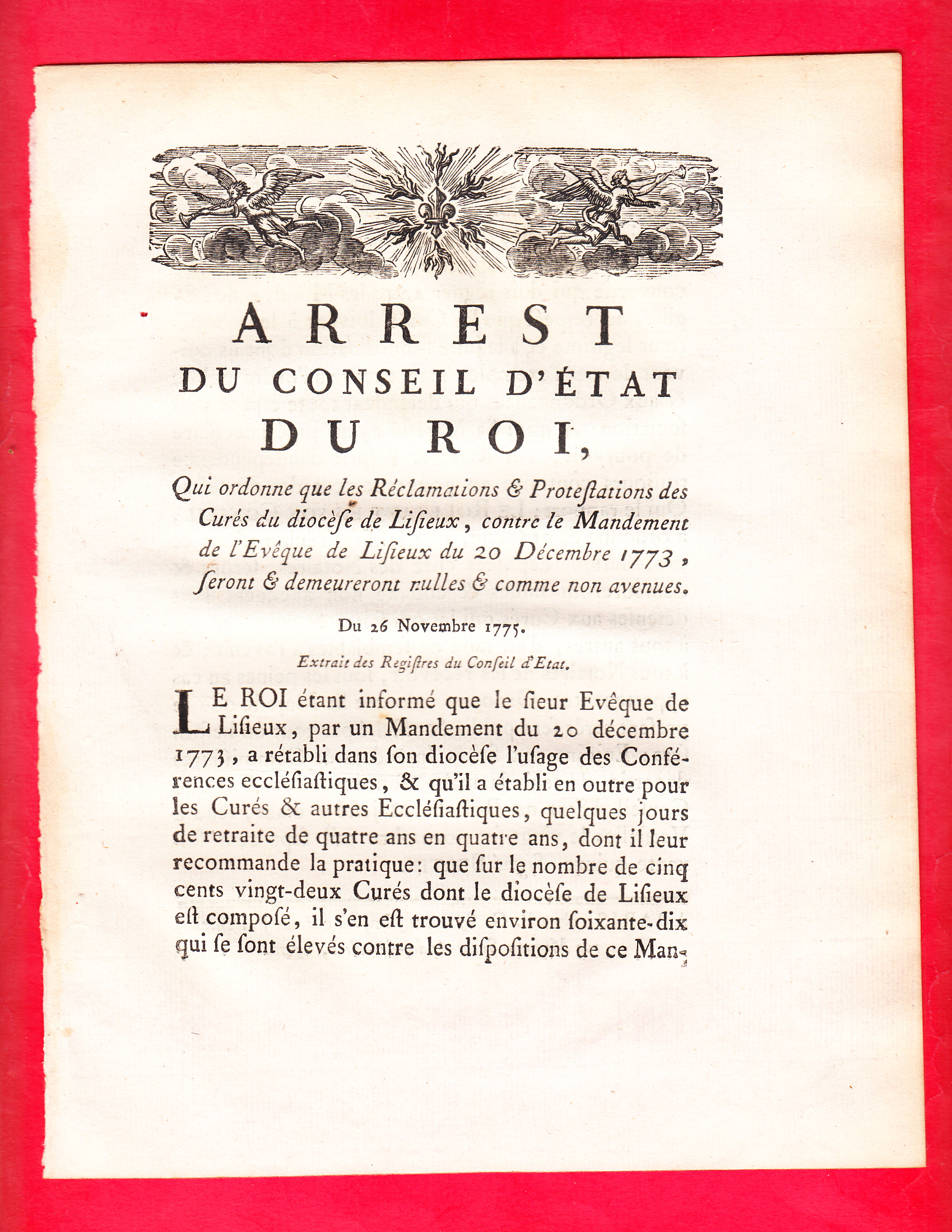 ARREST DU CONSEIL D'ETAT DU ROI, Qui ordonne que les Réclamations & Protestations des Curés du diocèse de Lisieux, contre le Mandement de l'Evêque de Lisieux du 20 Décembre 1773, seront & demeureront nulles & comme non avenues. Du 26 Novembre 1775.