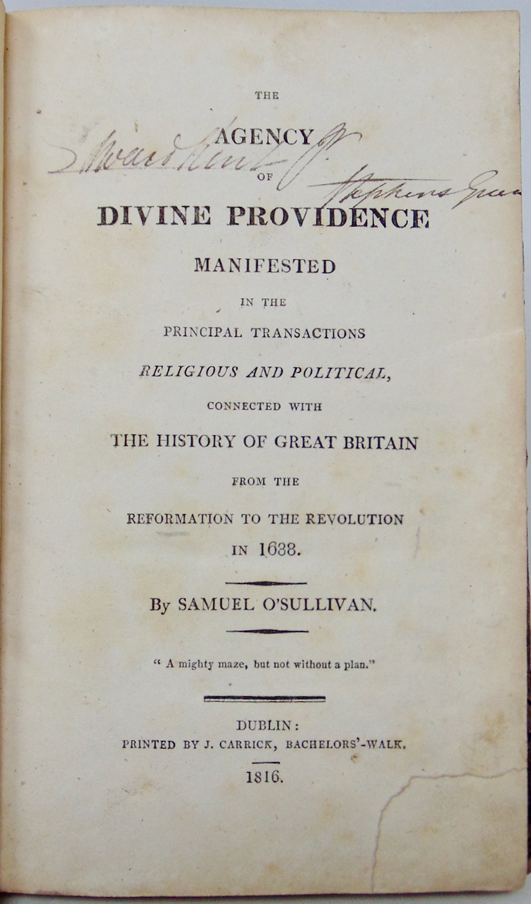 Brown leather spines & corners, red leather title label, marbled boards, 21.5 x 14 cm (8 1/2 x 5 1/4 inches). Binding is scuffed and worn, with cracked joints, boards are still attached. Margin tear and bottom corner loss to the title page. viii., 221, [2] generally clean pages, infrequent pencil marginalia, several indecipherable signatures on the tp, text block is tight. "The subject is very important and interesting, and the design may be considered new. For though many writers have incidentally alluded to the happy arrangement of affairs which facilitated the Reformation.none have given the subject that enlarged and ample consideration, which its importance demands, or furnished proofs of a regular and systematic plan of moral government, sufficiently full and satisfactory." - Preface.Samuel O'Sullivan (1790-1851), Church of Ireland minister and author, converted from Roman Catholicism sometime before 1812, when he entered Trinity College, Dublin (TCD). He was ordained priest and for many years was the chaplain of the Rolay Hibernian Military School. This 1816 publication, The Agency of Divine Providence Manifest." has been called a work of "remarkable maturity." "O'Sullivan devoted much time to literary pursuits and, maintaining his link with TCD, contributed articles to the Dublin University Magazine from its foundation in 1813. Many of these were on historical subjects, especially the events of 1798, but he also wrote on matters such as the state of the Irish Church and the Free Church movment in Scotland.[He] also published several articles in Fraser's Magazine and Blackwood's Magazine, and producted Catechism of the United Church of England and Ireland explained and confirmed (1850). In 1851 he was appointed Donnellan lecturer at TCD." - David Murphy, Dictionary of Irish Biography online.