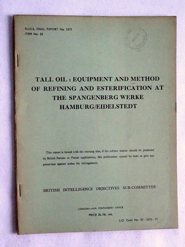 BIOS Final Report No 1571. Item No 22. Tall Oil. Equipment and Method of Refining and Esterification at the Spangenberg Werke Hamburg / Eidelstedt. British Intelligence Objectives Sub-Committee.