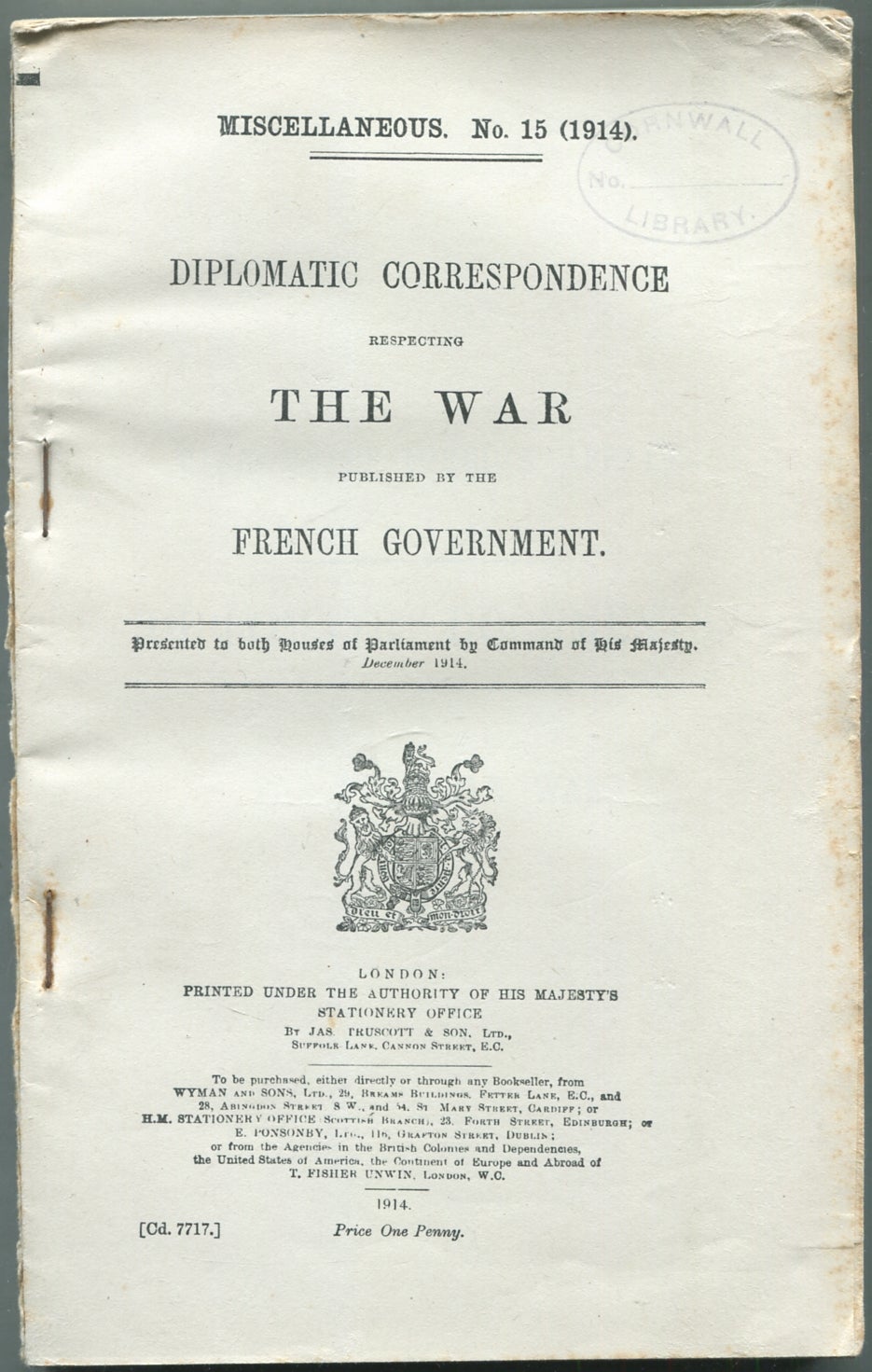 Published by His Majesty's Stationery Office by Jas. Pruscott & Son, London, 1914
