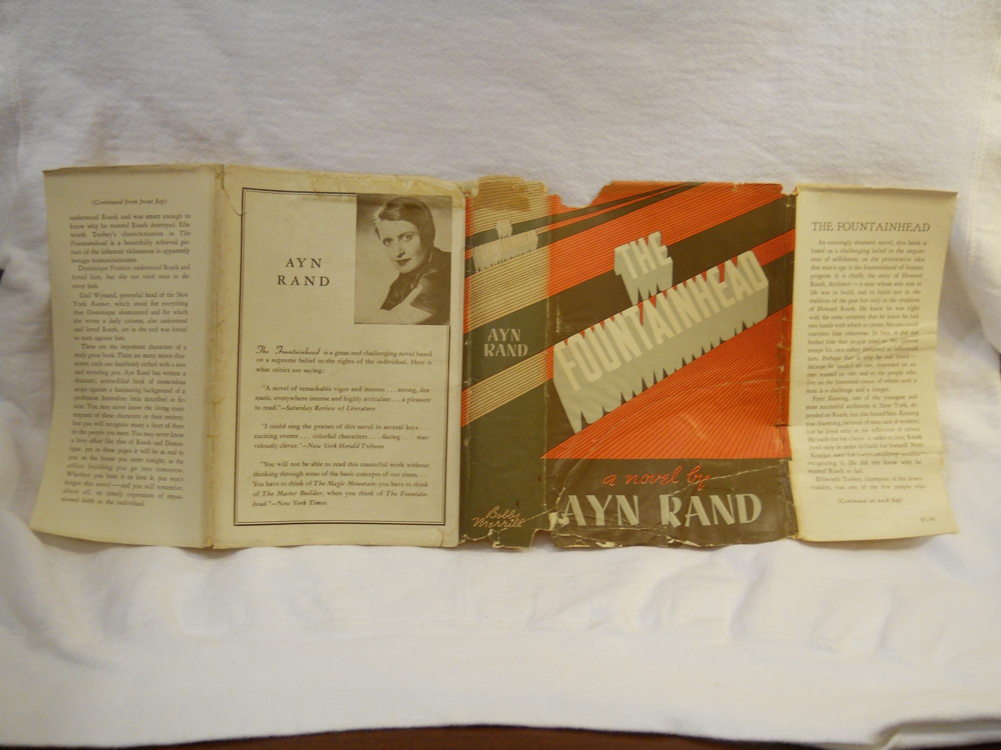 Add to basketFirst Edition, First Printing with green 2nd issue binding. The book is tight and solid, has modest general aging and discoloration to top one quartet of the front panel and to approximately one third of the back panel else very good or better. Dust jacket is 2nd issue with Rand s picture on back panel. It has wear and chipping to the edges top and bottom and a 1.5 by .5 inch chip to top left corner of front panel, assorted closed tares and some tape repair to verso else very good.