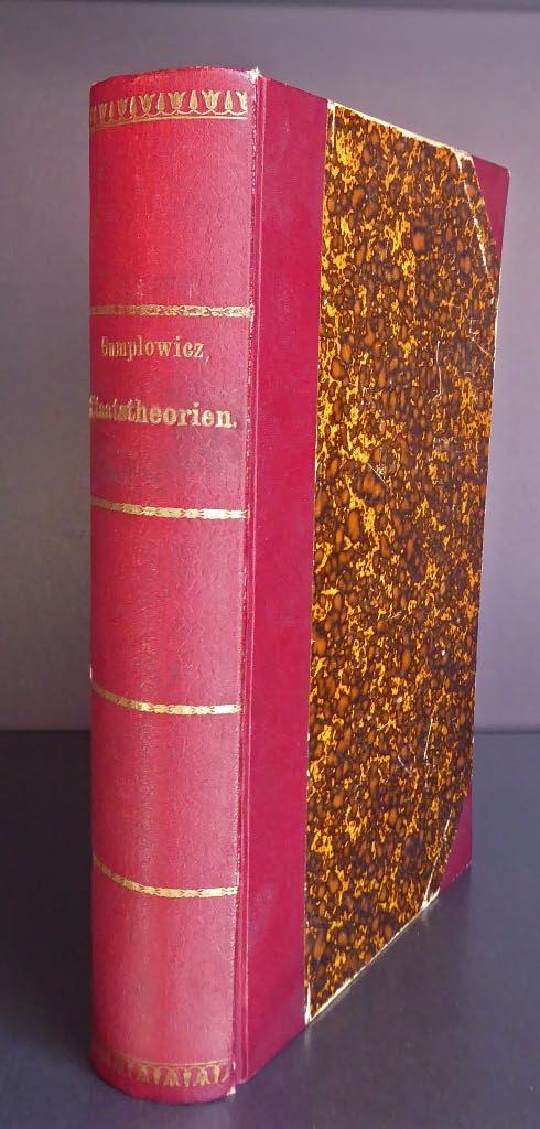 Add to basketXI, 592 Seiten, 8°, Halbleinenband der Zeit mit Rückentitel (gutes Exemplar). - Erste Ausgabe. - Ludwig Gumplowicz (1838 - 1909) gilt als einer "der Gründerväter der europäischen Soziologie. (.) Seine Herkunft aus der alsbald vom Vielvölkerstaat Österreich-Ungarn annektierten Republik Krakau und aus jüdischer Familie machte ihn mit der Problematik unterdrückter Ethnien früh vertraut und beeinflusste sein lebenslanges Eintreten für die Sache vor allem der slawischsprachigen Minderheiten im Habsburgerreich. Soziologisch ein früher Vertreter der späteren Konfliktsoziologie, nahm er zunächst die Rassen", nach seiner soziologischen Wende" die Gruppen" zum Ausgangspunkt und sah den Staat als Unterwerfungs-Institution jeweils bestimmter herrschender Gruppen. Theodor Geiger sah in ihm wie in Émile Durkheim einen Vertreter des Soziologismus, d. h. der Auffassung, dass die Gesellschaft als solche eine Art von Über-Persönlichkeit darstelle, die eine von ihren Gliedern unabhängige Existenz lebe. Gumplowicz Theorie lässt sich generell dem sozialwissenschaftlichen Positivismus unterordnen, demzufolge soziale Entwicklungen natürlichen Gesetzmäßigkeiten unterliegen, die aufzudecken die Aufgabe der Soziologie sei.(.)" (Wikipedia).