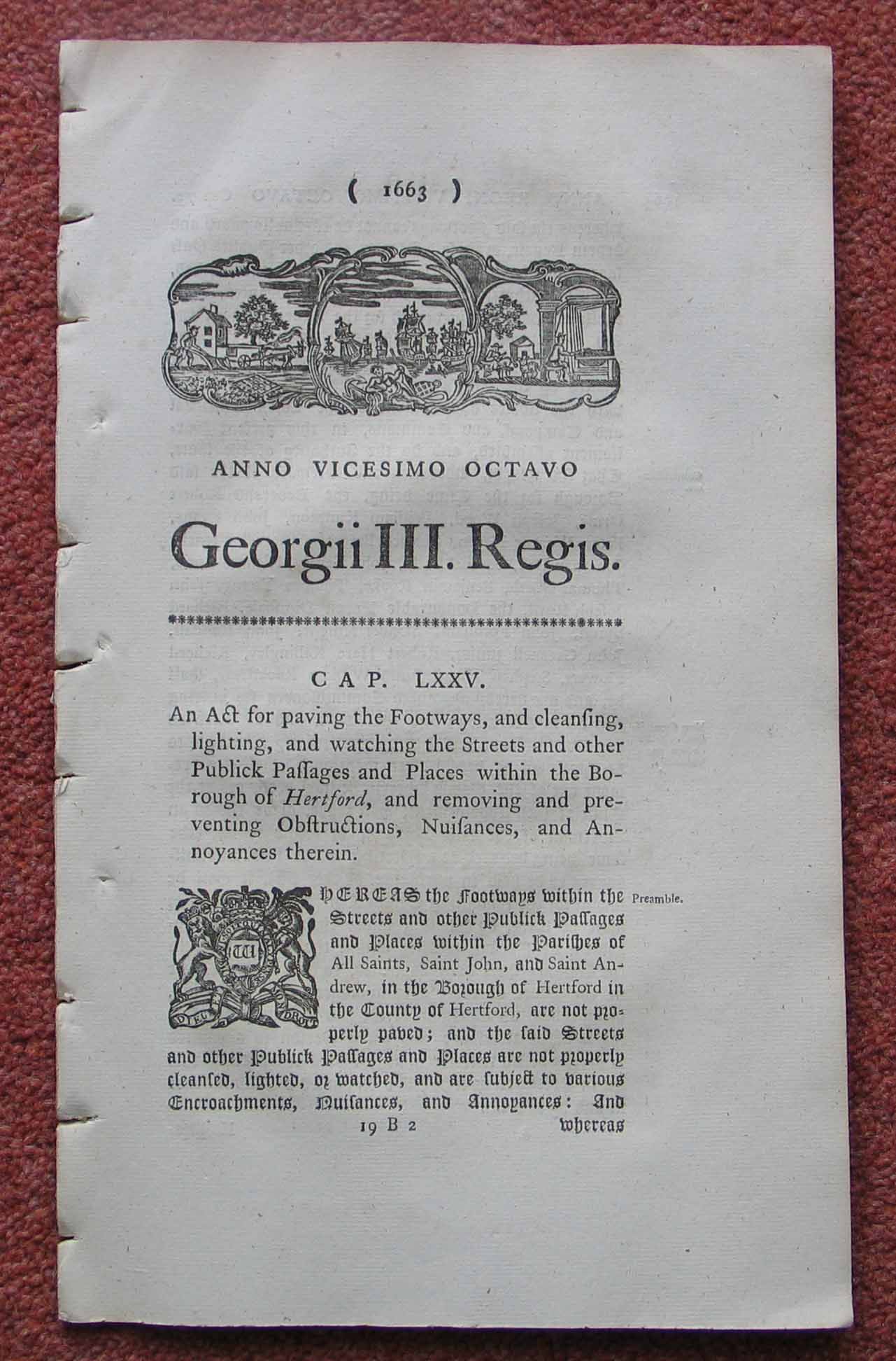 Hertford. Paving the footways and cleansing, Lighting and Watching the streets and other public passages and places. and removing and preventing Obstructions, nuisamces and annoyances therein. 26 Pages.