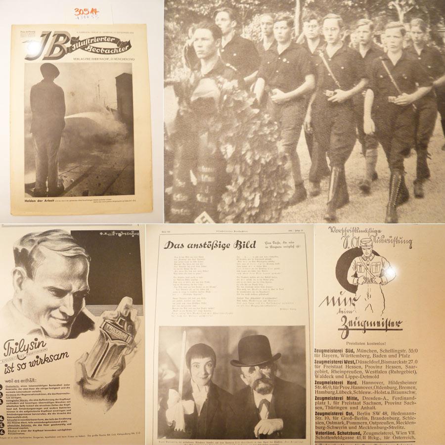 Vollständige Ausgabe im original Verlagseinband: ungeheftet, im Format 28 x 38 cm, mit fotoillustriertem Deckeltitel (Titelbild: "Helden der Arbeit sind es, die in der glühenden Hölle feuerflüssigen Metalls aushalten müssen "). Seiten 809-832, mit vielen - teilweise ganzseitigen - Fotoabbildungen, Schrift: Fraktur. - Aus dem Inhalt: Der Hochofen. Ein wichtiges Kapitel aus der deutschen Schwerindustrie, mehrseitiger Bildbericht - Der rote Mord am Hitlerjungen, ganzseitige Bildbericht ("Auf dem neuen Garnisonsfriedhof in Tempelhof wurde der von den Kommunisten feige ermordete Hitlerjunge Hans Hoffmann unter ganz außerordentliche große Anteilnahme der Bevölkerung beerdigt. Es nahmen starke Abordnungen der Berliner S.A., die gesamte Hitlerjugend und eine große Abordnung des Stahlhelm teil. Pfarrers Sawade hielt eine eindringliche Grabrede, worauf Dr. Goebbels das Wort zu einem schlichten und tiefen Nachruf nahm. Viele unserer wackeren S.A.- und S.S.-Männer haben schon für ihre Überzeugungen bluten müssen, aber sie sind Märtyrer auf dem Dornenwege ins neue, ins Dritte Reich . . . Wie üblich, war nunmehr ein riesiges Polizeiaufgebot erschienen, das man zuvor nötiger gebraucht hätte"), mit Fotos wie: "Die Kränze der Kameraden und der Gauleitung / Die Schar der Hitlerjungen, der Hoffmann angehörte / Die gramgebeugten Eltern am Grabe ihres Sohnes / Dr. Goebbels spricht am Grabe des feige Hingemordete / Berittene Polizei (etwas spät!) in Bereitschaft" - Der Glaube an Deutschland, Fortsetzungsroman von Hans Zöberlein - Unsere Meinung: Das Riesenkapital der Gewerkschaftsbürokratie und die Not der Arbeiter. Die Reichsreform im Lichte Tuntenhausens - Humor - Deutsche Bauern, heraus! - Das anstößige Bild, Gedicht von Pidder Lüng über eine auf der gleichen Seite wiedergegebene Fotoabbildung "Karl Valentin, der weltbekannte Münchner Komiker, und seine Partnerin Liesl Karlstadt in einer Szene des Einakters "Der Firmling". Das Bild wurde von der Polizei beanstandet und dessen Entfernung aus dem Schaukasten angeordnet!" - Lippenstift und Puderquaste in der Antike - Franzosen in Deutschland. Ein lehrreiches Kapitel aus der Geschichte, doppelseitiger Bildbericht über die Zerstörungen am Heidelberger Schloss durch die Franzosen im 17. Jahrhundert - Der Funk-Beobachter - Deutsche Ernte, doppelseitiger Bildbericht mit Zeichnungen von Kunstmaler Albert Reich / München - Einem Kämpfer zum Gedächtnis. Die Arbeit des Nationalsozialisten Gemeinder, ganzseitige Bildbericht auf der letzten Umschlagseite ("Das so unerwartet mitten aus dem vollen Schaffen und Leben erfolgte Hinscheiden des Gauleiters der nationalsozialistischen Bewegung in Hessen bedeutete für uns alle einen herben Verlust. Pg. Gemeinder hat in begeistert-zähem Fanatismus sein ganzes Ich, seine volle Persönlichkeit ohne Bedenken für unsere große Bewegung im Reichstag sowohl als im Gau Hessen eingesetzt"), mit Bildern wie: "Eine der zahllosen Kundgebungen von Tausenden, wo der bewährte Kämpe unserer Sache mit hinreißendem Erfolg gesprochen hat / Sein heißersehntes Ziel: das Erich-Jost-Parteiheim in Darmstadt / Die Mitstreiter Gemeinders (Gauleitung) in Hessen", Gruppenbild - Deutsches / Drittes Reich, Deutschland vor der Machtergreifung, hessischer Gauleiter Gemeinder, von Rotfront ermordeter Hitlerjunge Hoffmann/Tempelhof, Blutzeugen der nationalsozialistischen Bewegung, Kampfzeit der NSDAP, nationalsozialistisches Erich-Jost-Parteiheim in Darmstadt, Zeitgeschichte 1923-1945, NS.-Presse, einzig anerkannte Bilderzeitung der N.S.D.A.P, , / Bildgut. - Erstausgabe in sehr guter Erhaltung, weitere Beschreibung s.Nr. 31753 ! Versand an Institutionen auch gegen Rechnung Sprache: Deutsch Gewicht in Gramm: 2000.