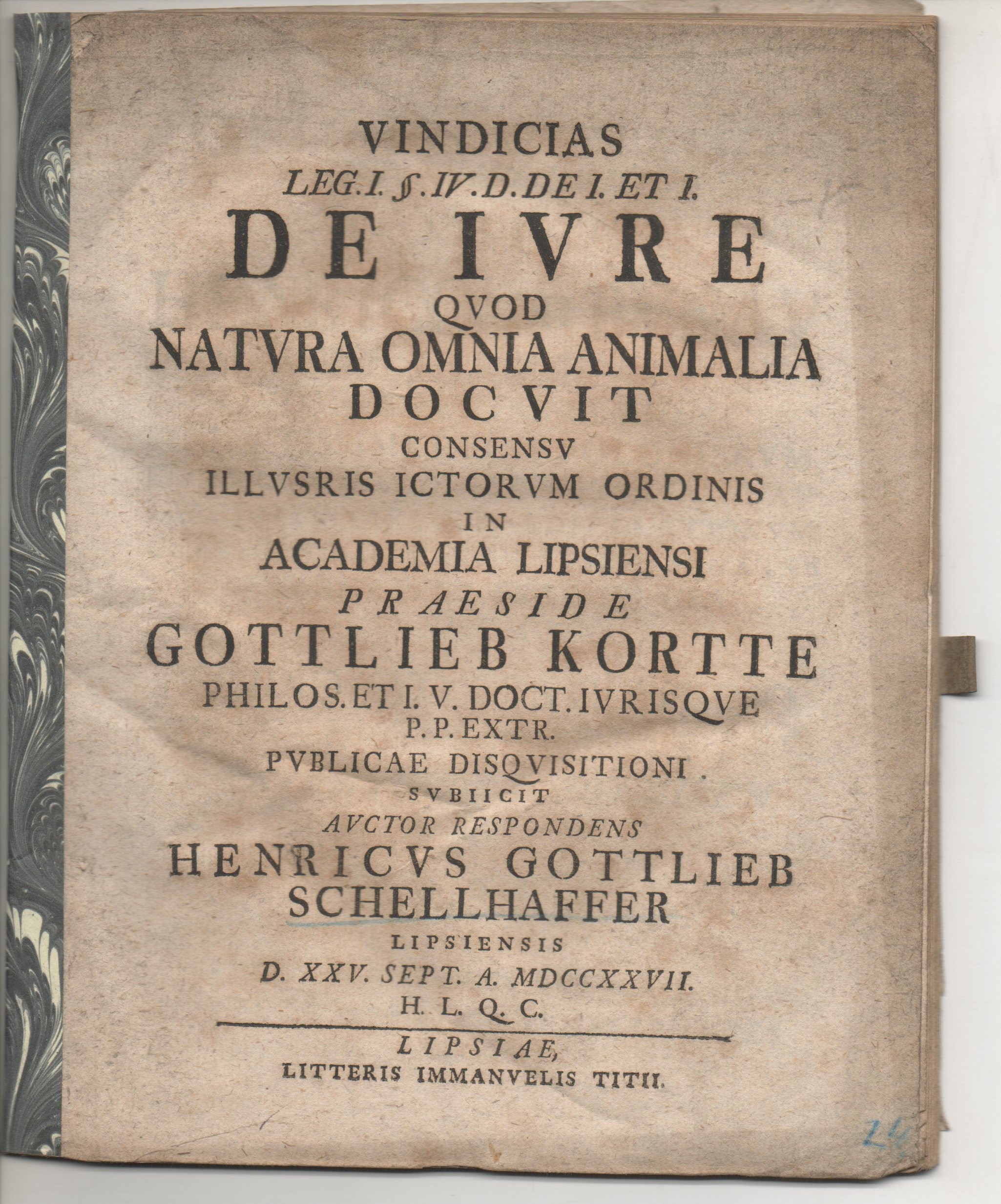 Juristische Disputation. Vindicias leg. I. §. IV. D. de i. et i. de iure quod natura omnia animalia docuit.