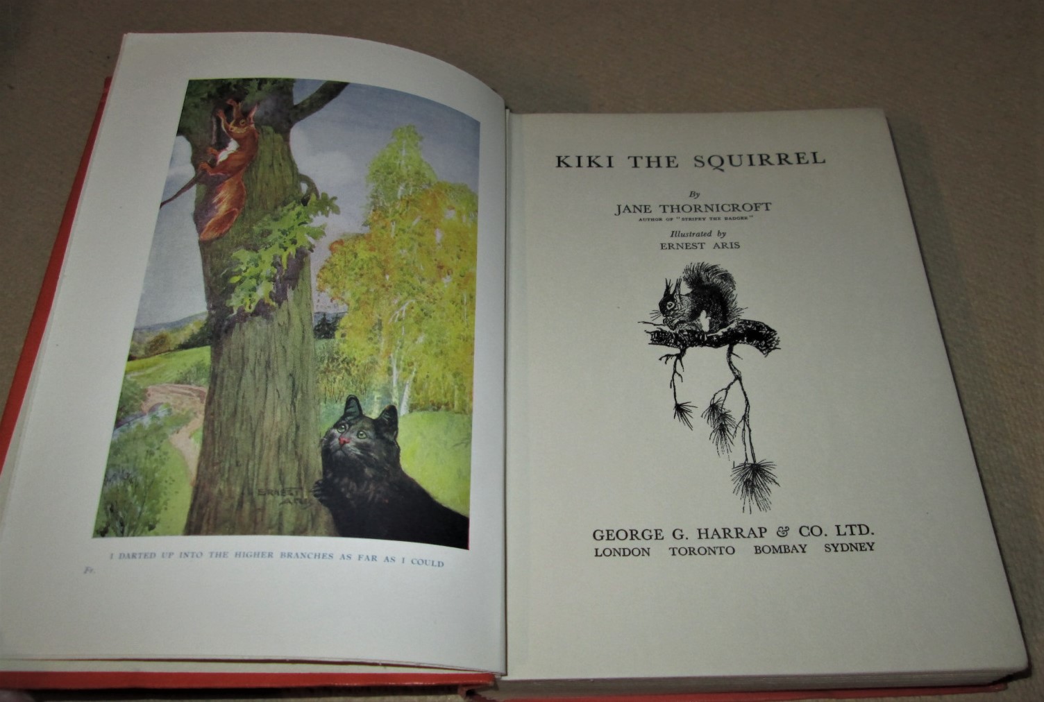 Add to basket256 p. 20 cm. Sound and square binding in cloth-covered boards. Corners and spine ends softened. Edges have a few tiny dings. Light soil spots to boards and spine. Pencilled owner's name and note on front free endpaper. Tiny spot on Contents page. Otherwise, the inside pages are clean and unmarked. The story of a squirrel named Kiki and told from his perspective. Illustrated with a colour frontispiece, four black and white plates and internal pen and ink art by Ernest Aris, who also illustrated for the Ladybird series of books.