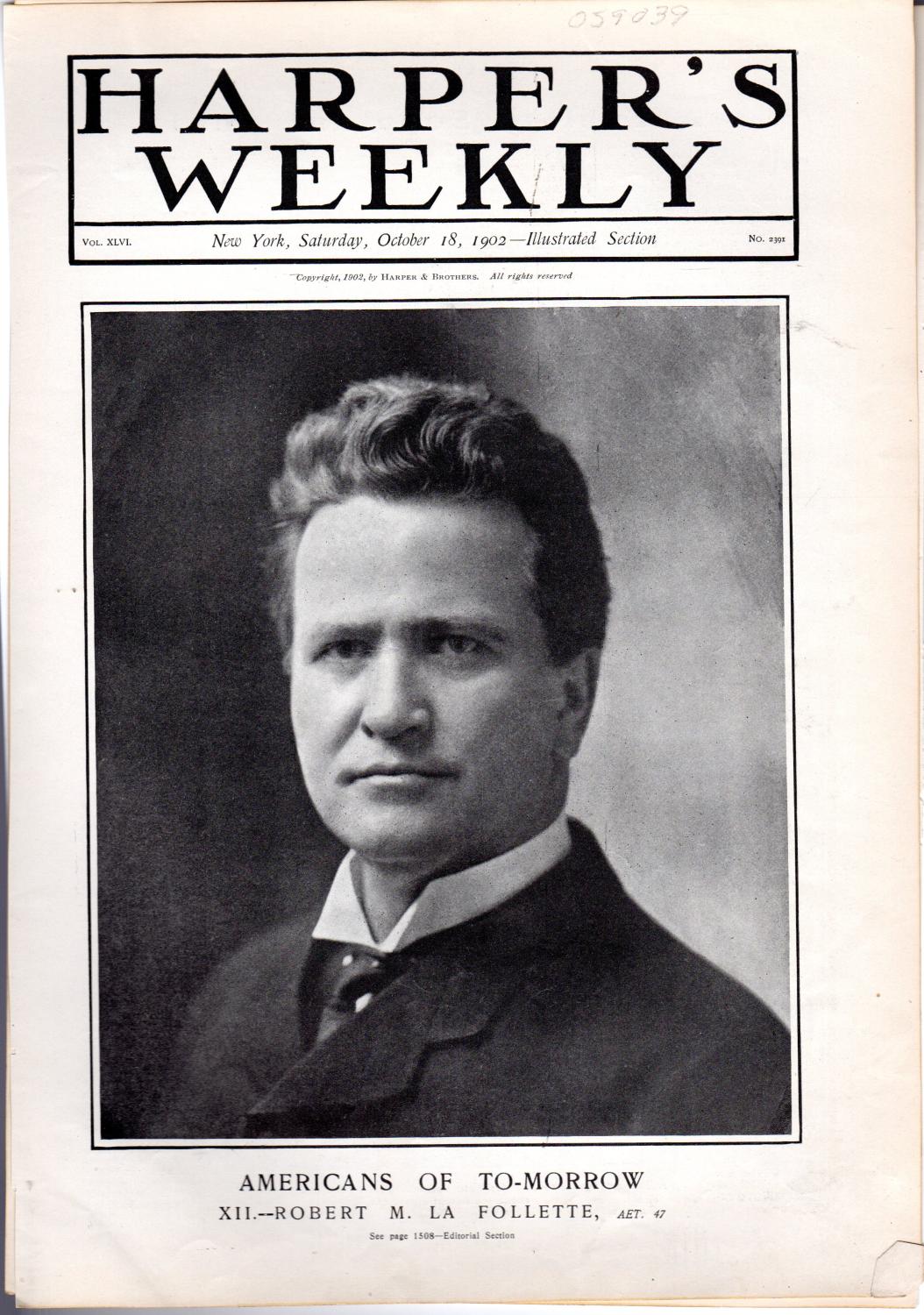 PRINT: "Americans of Tomorrow: Robert M. La Follette".photoengraving from Harper's Weekly, October 18, 1902