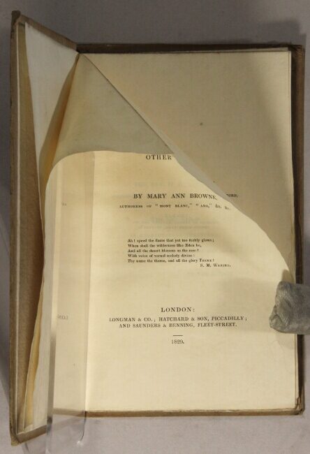 First edition, 12mo, pp. viii, 118; errata slip tipped in at p. [1]; original drab paper-covered boards, printed paper label on spine; a few smudges, the label a little rubbed; all else very good, sound, and clean. Mary Ann Browne (1812-1845) published her first book of poetry at the age of just 15 and was only 17 when Repentance was published. In all she published seven books of poetry and many more poems, songs, and musical scores appeared in periodicals.