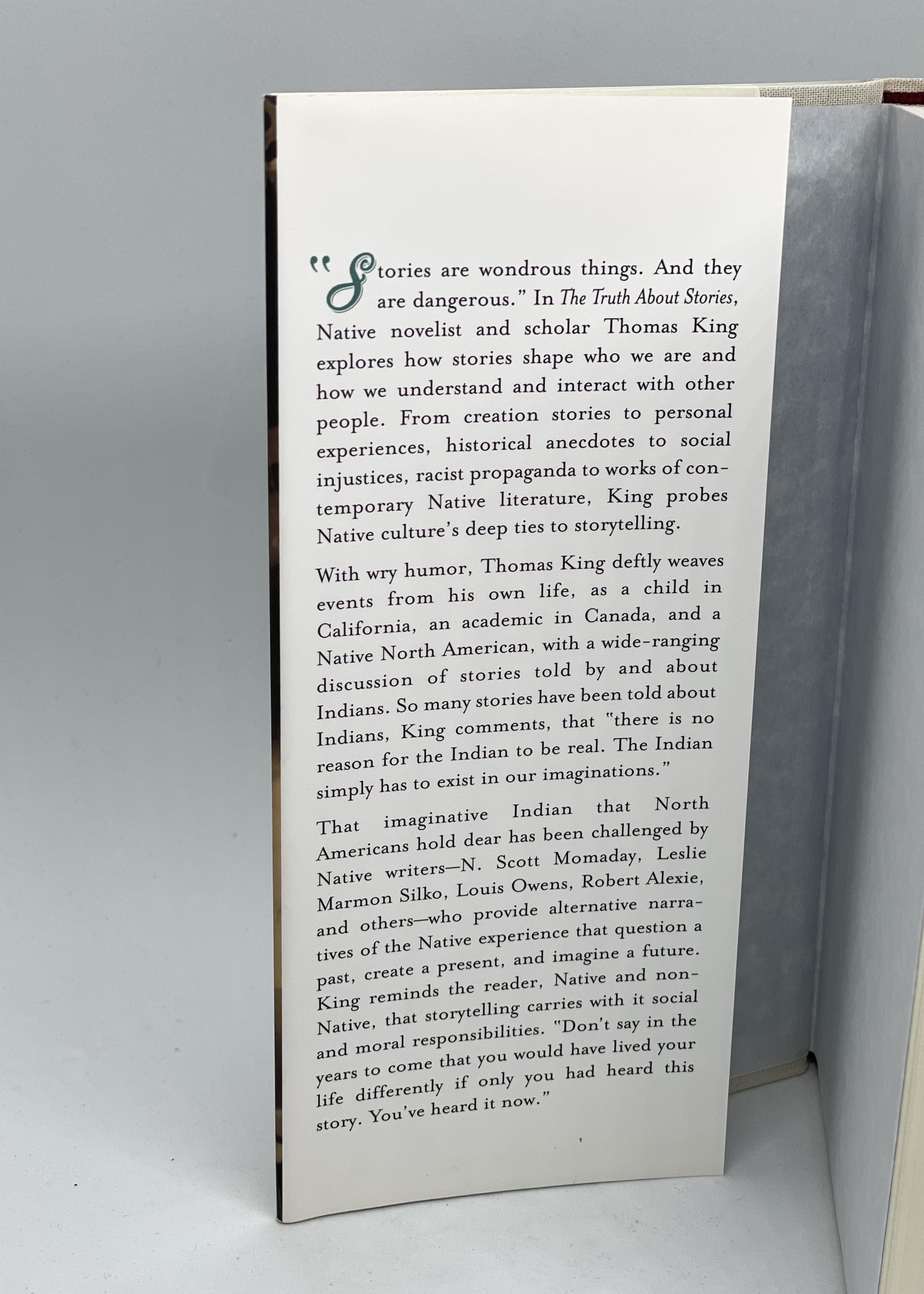 "Stories are wondrous things. And they are dangerous." In The Truth About Stories, Native novelist and scholar Thomas King explores how stories shape who we are and how we understand and interact with other people. From creation stories to personal experiences, historical anecdotes to social injustices, racist propaganda to works of contemporary Native literature, King probes Native culture's deep ties to storytelling. With wry humor, King deftly weaves events from his own life as a child in California, an academic in Canada, and a Native North American with a wide-ranging discussion of stories told by and about Indians. So many stories have been told about Indians, King comments, that "there is no reason for the Indian to be real. The Indian simply has to exist in our imaginations." That imaginative Indian that North Americans hold dear has been challenged by Native writers - N. Scott Momaday, Leslie Marmon Silko, Louis Owens, Robert Alexie, and others - who provide alternative narratives of the Native experience that question, create a present, and imagine a future. King reminds the reader, Native and non-Native, that storytelling carries with it social and moral responsibilties. "Don't say in the years to come that you would have lived your life differently if only you had heard this story. You've heard it now."