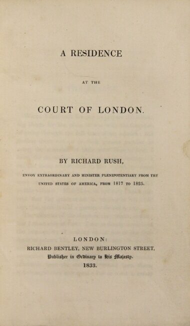 First British edition, 8vo, pp. [3], vi-xviii, 420; original drab paper-covered boards, printed paper label on spine; spine chipped at extremities, label a little worn, joints starting, three pages with pencil marginalia; very good. Armorial bookplate of T. A. Walker on pastedown, Richard Rush (1780-1859), the son of Benjamin Rush, served in many prominent positions, including Attorney General of Pennsylvania, Comptroller of the Treasury during the James Madison administration, United States Attorney General, acting Secretary of State (albeit briefly), Secretary of the Treasury, and he was a candidate for the Vice Presidency of the United States on John Quincy Adams's ticket in 1828. Howes R-522: "Present the diplomatic maneuvers concerning the conflicting claims to Oregon and the adjustment of a Northwestern boundary line.".