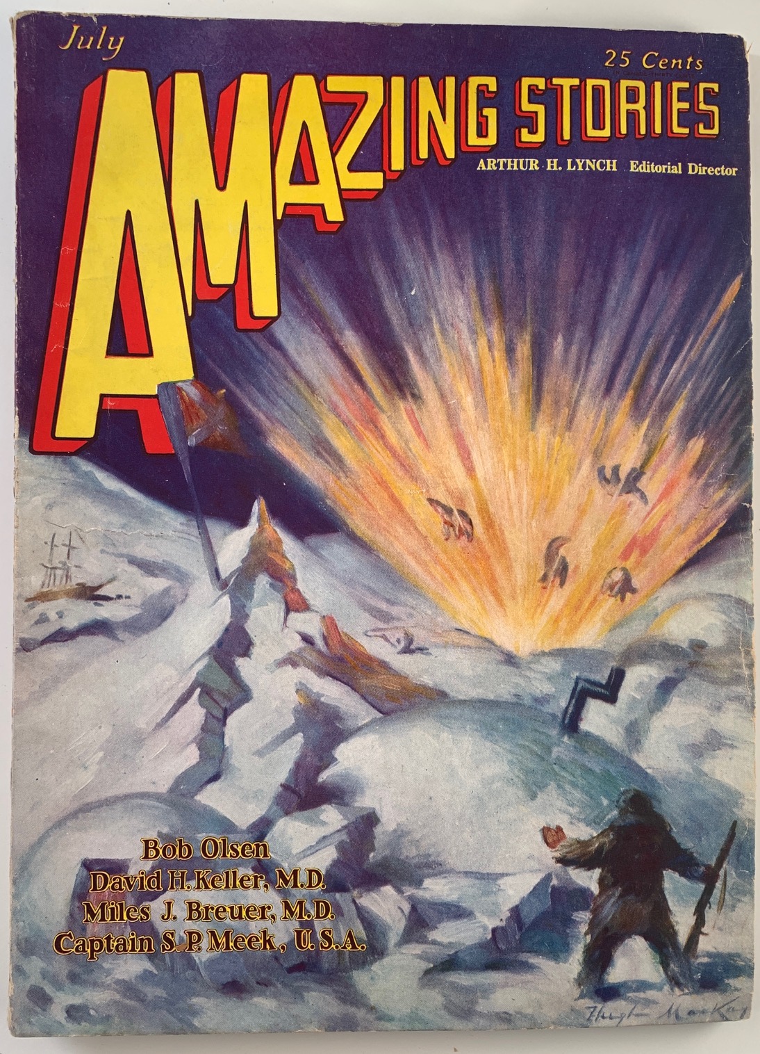 Add to basketPulp magazine, 11.5" x 8.5" w. Arthur H. Lynch, Editorial Director. Stories by Bob Olsen, David H. Keller, M.D., Miles J. Breuer, M.D, Captain S. P. Meek, Jules Verne and others. Pictorial cover illustrating Jules Verne's "The Desert of Ice" and other full page story illustrations. Tanned paper, pliant, but handle with care. Tears (1-1/2" at front top edge of spine and 2-1/2" on staple edge of first page). Good+ condition.