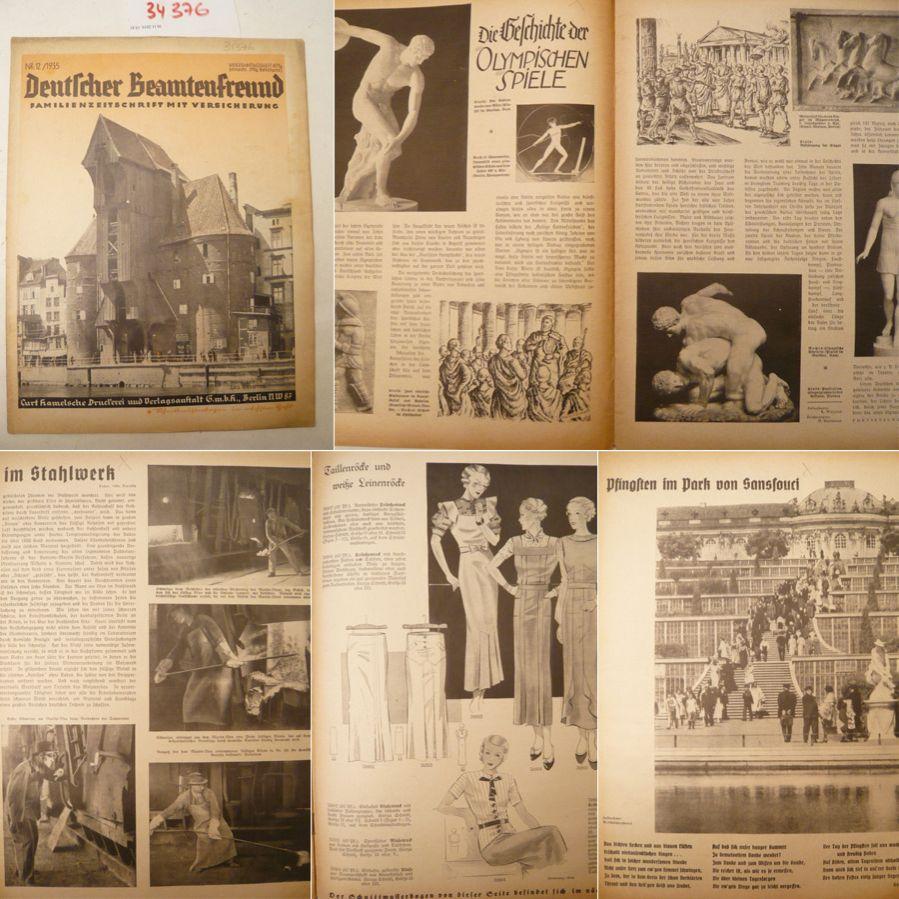 Vollständige Ausgabe im Original-Verlagseinband (klammergeheftete Broschur im Format 23,5 x 30,7 cm) mit fotoillustriertem Titel ("Ein Wahrzeichen Danzigs - das Krantor"). 23 Seiten, Schrift: Fraktur, mit sehr vielen Fotoabbildungen und einigen Zeichnungen. - Aus dem Inhalt: Deutschlands Gleichberechtigung - die Voraussetzung für den Frieden Europas, von Kommerzienrat Dr. Hermann Röchling / Völklingen - Pfingsten im Park von Sanssouci, ganzseitige Fotoabbildung - Museum und Volk, doppelseitiger Bildbericht von Magdalene Säwert - Arbeitskamerad im Stahlwerk, doppelseitiger Bildbericht - Die Geschichte der Olympischen Spiele, doppelseitiger Bildbericht - Olympiavorbereitungen in Deutschland, doppelseitiger Bildbericht u.a. mit einer halbseitigen Abbildung "Modell der für die Olympiade 1936 gebauten deutschen Kampfbahn im Grunewald bei Berlin" - Robert Koch. Ein persönliches Erinnerungsblatt zu seinem 25. Todestag von Paul Lindenberg - Klippen des Schicksals, Roman von Erich von Voss - Für die Beamtenfrau / Das Reich der Frau: Modeteil mit Modezeichnungen (Alles, was wir für die Reise brauchen, fertigen wir selbst an / Taillenröcke und weiße Leinenröcke) - Kleinanzeigenteil. - Deutsches / Drittes Reich, Beamten-Zeitschrift im Nationalsozialismus, nationalsozialistische Presse, Olympiade 1936, Reichssportfeld in der Reichshauptstadt, deutsches Berufsbeamtentum im 3, Reich, Frauenmode, Damenmode für die Beamtenfrau / -gattin / Beamtin, modische Kleidung für die deutsche Volksgenossin, , . - Erstausgabe in guter Erhaltung Versand an Institutionen auch gegen Rechnung Sprache: Deutsch Gewicht in Gramm: 2000.