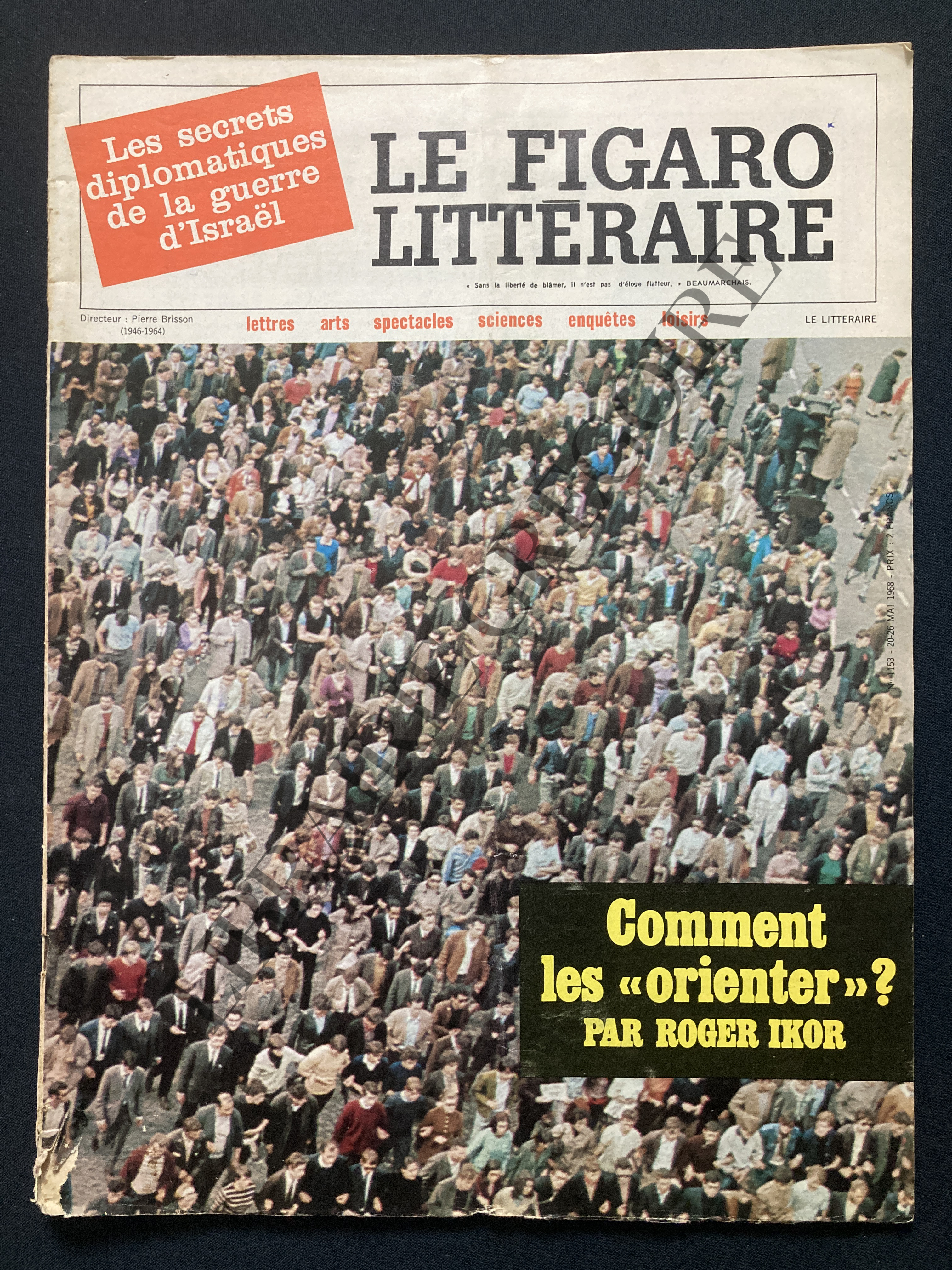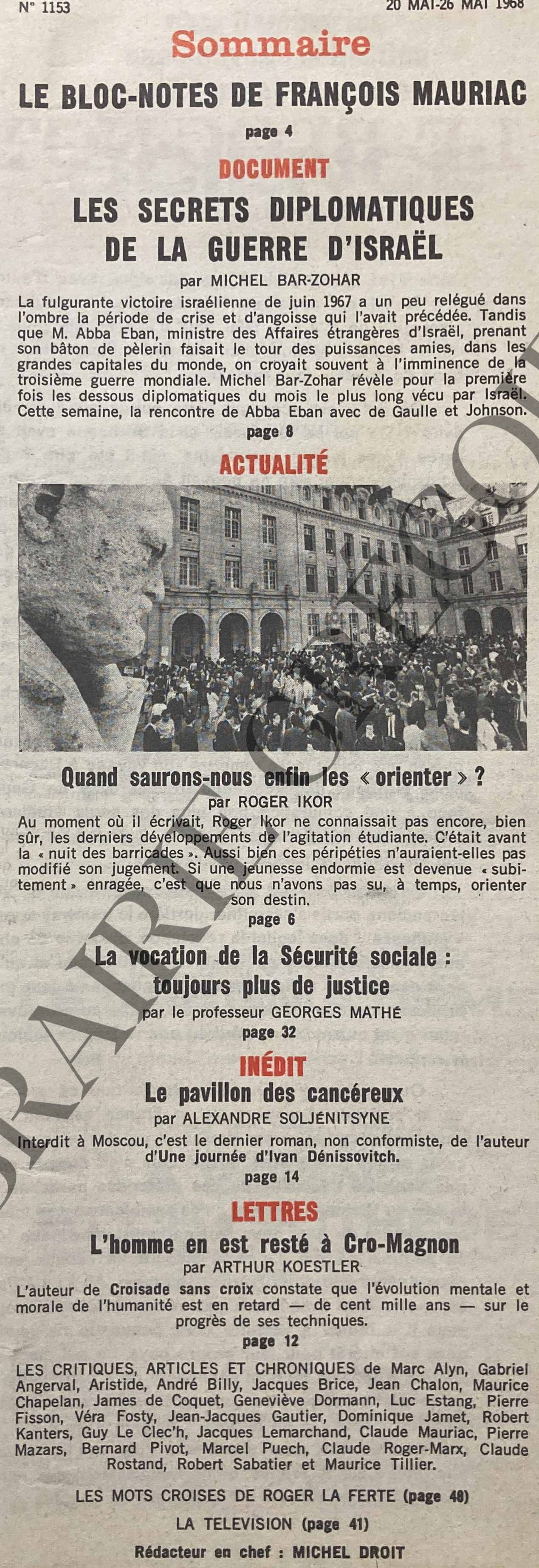 Add to basket50 PAGES-LE BLOC NOTES DE FRANCOIS MAURIAC, 2P-EVENEMENTS DE MAI 1968; TEXTE DE ROGER IKOR SUR LA JEUNESSE, 2P-LES SECRETS DIPLOMATIQUES DE LA GUERRE D'ISRAEL, 3P-L'HOMME EN EST BIOLOGIQUEMENT RESTE A CRO MAGNON, 2P-PRESENTATION DU ROMAN "LE PAVILLON DES CANCEREUX" D'ALEXANDRE SOLJENITSYNE, 3P-CRITIQUE PAR ROBERT KANTERS DES ESSAIS DE MICHEL BUTOR "LA MODIFICATION" ET "6.800.000 LITRES D'EAU PAR SECONDE", 1P1/2-CRITIQUE PAR LUC ESTANG DU LIVRE "UNE FEMME PRISONNIERE" DE JEAN JACQUES GAUTIER, 1/2P-CRITIQUE PAR MAURICE CHAPELAN DU LIVRE "JOURS DE KABYLIE" DE MOULOUD FERAOUN, 1/2P-ENTRETIEN DE JACQUES PAOLI, 1/2P-ANDRE BILLY RACONTE LECONTE DE LISLE, OCTAVE AUBRY ET RENE BOYLESVE, 1P-ENTRETIEN DE MARGUERITE YOURCENAR PAR JEAN CHALON, 1P-CRITIQUES PAR ROBERT SABATIER DES LIVRES "L'OBSESSION DE DELPHES" DE JEAN SULLIVAN, "LA MORT DE PERSONNE" DE DOMINIQUE ABADIE ET "LES VENDANGES" D'ANNE HURE, 1/2P-TEXTE DE GEORGES MATHE SUR LA VOCATION DE LA SECURITE SOCIALE, 2P-REPORTAGE DE PIERRE FISSON SUR LA NOUVELLE ZELANDE, 2P-CRITIQUE PAR JACQUES LEMARCHAND DE LA PIECE "LES ROSENBERG NE DOIVENT PAS MOURIR" D'ALAIN DECAUX JOUEE AUX TRETEAUX DE FRANCE, AVEC SILVIA MONFORT ET BERNARD ROUSSELET (PHOTOS), 1P-CRITIQUE PAR CLAUDE MAURIAC DU FILM "LES GAULOISES BLEUES" DE MICHEL COURNOT PRESENTE AU FESTIVAL DE CANNES, 1P-TEXTE DE PIERRE MAZARS SUR JAN LEBENSTEIN AVEC REPRODUCTION DE SON TABLEAU "AUX PETITS SOINS", 1/2P-LA ROBE QUI VAUT UN MILLIARD, MODELE DE PACO RABANE PORTE PAR FRANCOISE HARDY POUR L'INAUGURATION DE L'EXPOSITION, 1/4P-LA PHILATELIE AVEC CLAUDE DARGET: LES GRANDS HOMMES, 1/2P-DECOUPAGE EN TOUTE DERNIERE PAGE D'UN COUPON A RETOURNER (VOIR PHOTO).
