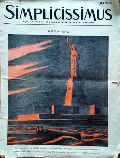 Add to basketVerlag Knorr & Hirth Kommanditgesellschaft. 46 Jahrgang (Ano 46), Nummer 42 (N.º 42). München (Deutschland). 1941. De 38x28 cm. Com 16 págs, numeradas de 658 a 672. Brochura. Profusamente ilustrado. Revista satírica e política alemã com periocidade semanal criada por Albert Langen em 1896 e publicada até 1967. Language: Alemão / German Location/localizacao: I-6-A-39.