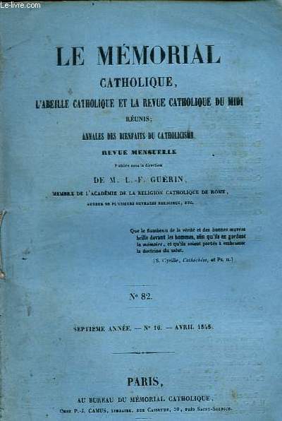 Le mémorial catholique, l'abeille catholique et la revue catholique du midi réunis: Annales des bienfaits du catholicisme n°82 - 7e année n°10 avril 1848 - Actes du saint Siège - Bref de S. S. Pie IX à Mgr le Nonce Apostolique au sujet des affaires etc.