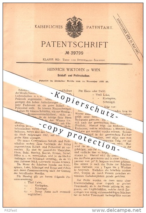 original Patent - Heinrich Wiktorin in Wien , 1886 , Schleifscheiben u. Polierscheiben , Schleifen , Polieren !!!