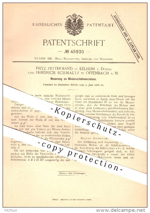 original Patent - F. Pettermand / Kelheim , F. Schmaltz / Offenbach , 1888 , Rinden - Schälmaschine , Forst , Holz !!!