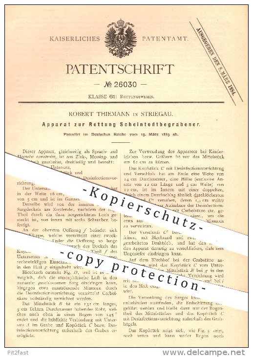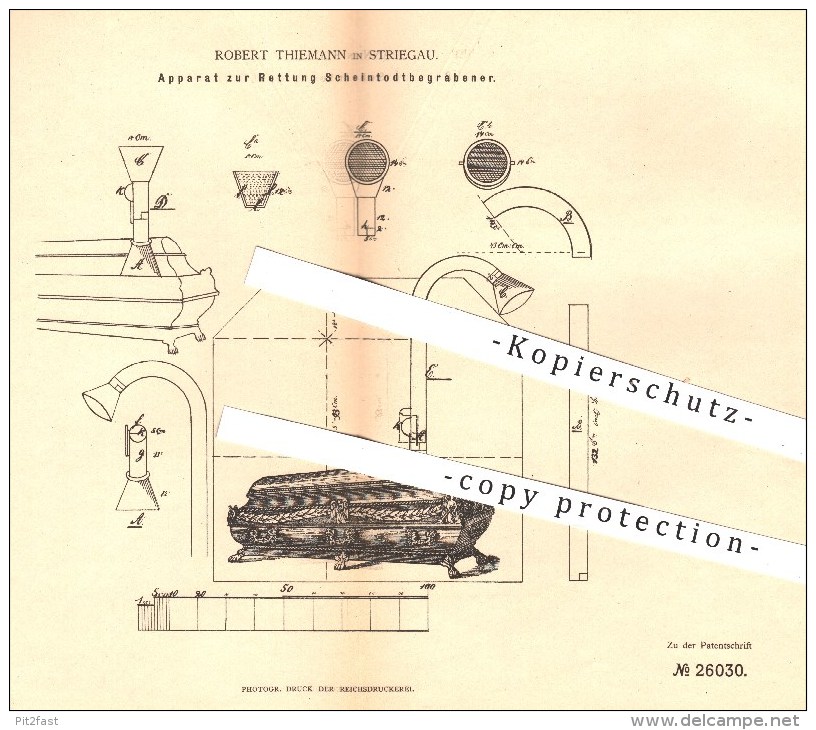original Patent - Robert Thiemann , Striegau , 1883 , Rettung Scheintot - Begrabener , Bestattung , Sarg , Tod , Grab !!