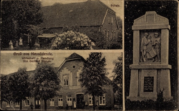 Ansichtskarte / Postkarte Neusüdende Rastede in Oldenburg, Kriegerdenkmal, Wirtschaft und Handlung, Schule - Inh. Gerhard Rinken