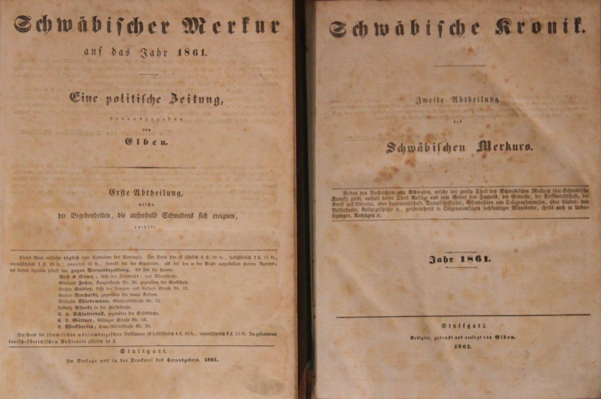 Eine politische Zeitung, verfaßt von Elben. Dazu Schwäbische Chronik. Jeweils 1. und 2. Quartal in zus. 2 Bänden.