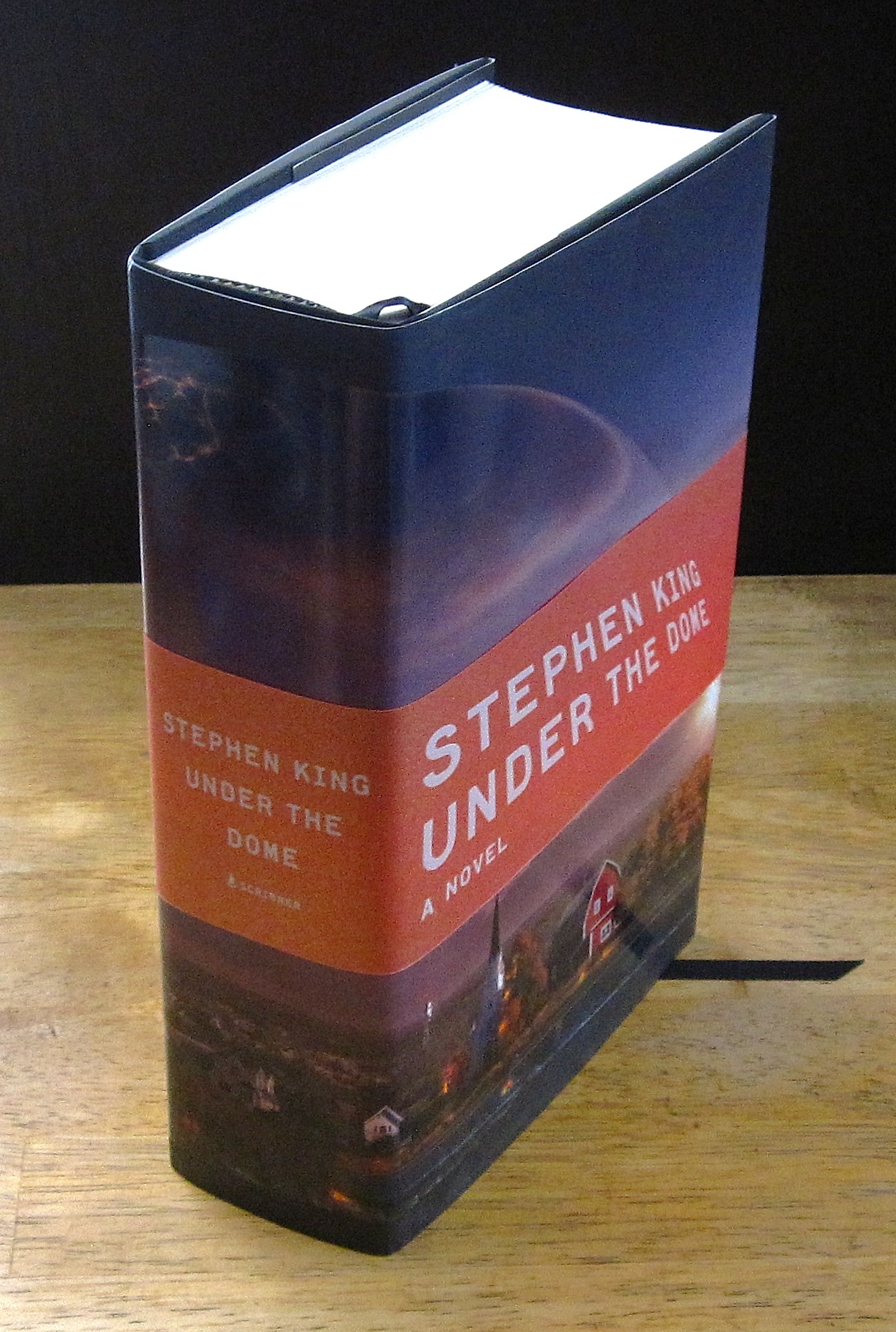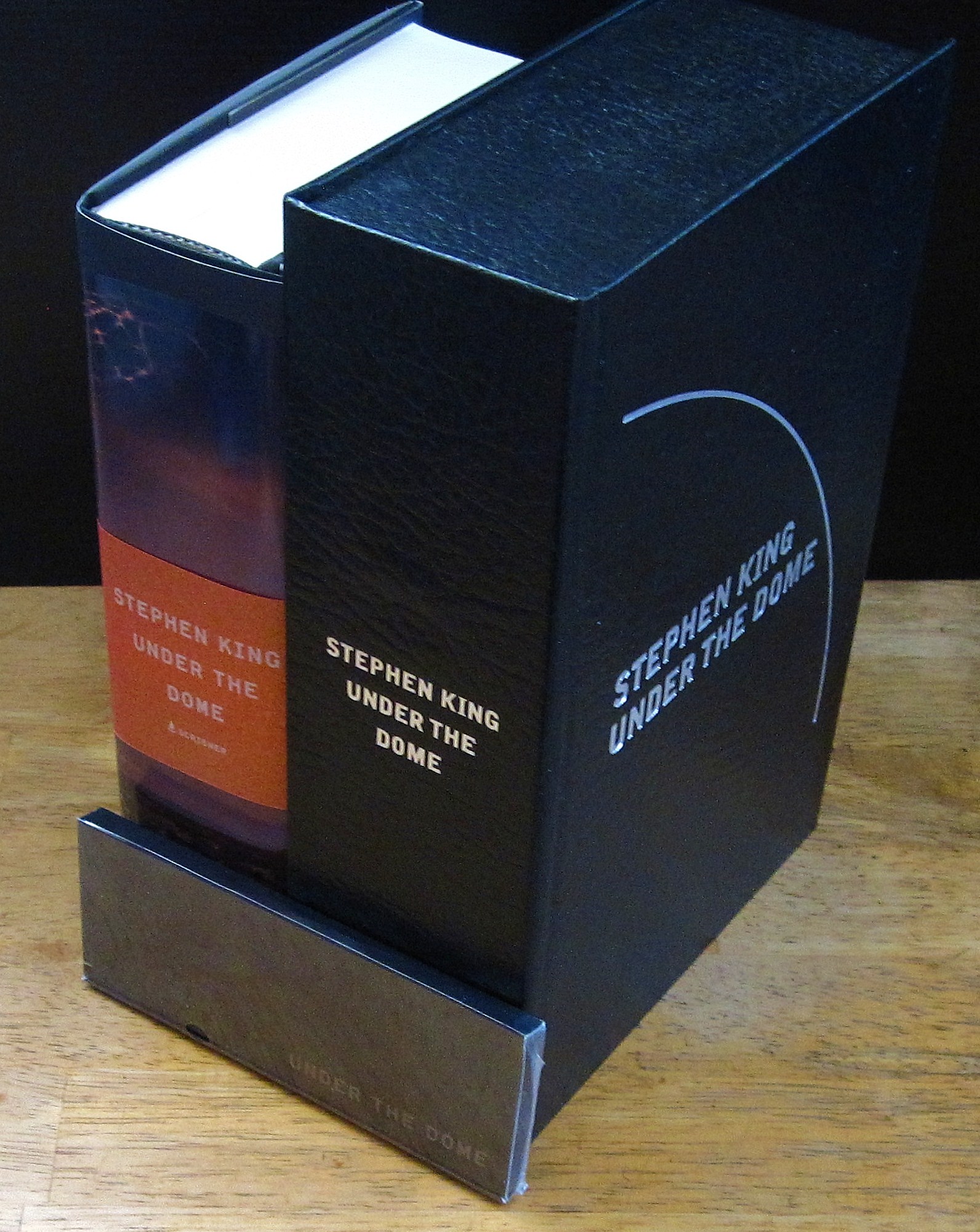 Limited signed edition of 1,500 in custom slipcase. From copyright: "This Scribner collector's edition November, 2009." Beautifully signed by Stephen King at front endpaper: "Stephen King". Black full cloth boards, silver embossed spine titles, light shelf wear. Horace Greeley, the feisty Corgi, blind-stamped at front board. Pages fine; no writing. Book itself also includes a black satin ribbon marker. Pictorial map endpapers in vibrant colors unique to this edition. Fine bind; hinges intact. Dust wrapper near fine; unclipped 200.00, protected in new clear sleeve. Classic wrap-around jacket art by Platinum FMD and design by Rex Bonomelli using a combination of illustration, photographs, and 3D renderings w/cover, spine titles, and publisher info being the only words on entire jacket. This special wrapper features wrap-around orange metallic half-jacket with the titles; moderate roll to spine area. This edition is enhanced with illustration by Matthew Diffee; frontispiece and illustrated character vignettes before each chapter. Also, a matching set of collector cards with summary character descriptions at back; stored in sealed tray case with titles. Re-live the story through the cards! Presented and preserved in fine black textured leather (or leather-like) clamshell case with silver metallic impressed cover and spine titles with partial dome over cover titles. Heavy sturdy case perfectly fits this collector's edition and cards. Interior lined with a deep black silk moire-like material with a beautiful sheen. When invisible and mysterious force field descends upon a small fictional town of Chester's Mill, Maine, trapping residents inside, they are cut off from the rest of civilization. The trapped townsfolk must discover the secrets and purpose of the "dome" and its origins, while coming to learn more than they ever knew about each other. Don't be caught in Chester's Mill on Dome Day. On a beautiful fall day, the town is inexplicably and suddenly sealed off from the rest of the world by an invisible dome. No one knows what this barrier is and when - or if - it will go away. After the firmament seals off Chester Mills from the rest of the world, it is up to Dale Barbara, an Iraq veteran, and a select group of citizens to save the town, if they can get past Big Jim Rennie, a murderous politician, his son, who hides a horrible secret in his home, and a strange device at the center. King's epic novel stirs the intrigue. 1074 pages. Printed in the U.S.A. Insured post. Size: 8vo - over 7¾" - 9¾" tall. Seller Inventory # 020892