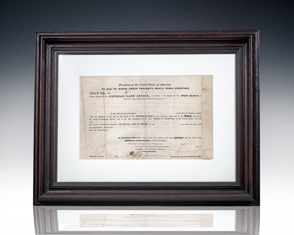 Rare Presidential Land Grant signed by Andrew Jackson as President. Quarto, one page partially printed and accomplished in manuscript, the document is dated January 4, 1830 and grants a quarter of land in Vigo County, Indiana to Charles B. Modesitt. The recipient, Charles Burns Modesitt, was a physician and businessman and one of the first settlers of Vigo County. He became an early adherent of the Church of Latter Day Saints beginning in 1838. Matted and framed. In very good condition. The piece measures 22.6 inches by 18.3 inches. American statesman and soldier Andrew Jackson was inaugurated as the seventh President of the United States of America in 1829 after defeating President John Quincy Adams in a landslide electoral victory. "The Age of Jackson" was marked by a shift and expansion of democracy with a goal of passing a portion of the political power of the established elites to the ordinary voter, or "common man" whom Jackson strongly believed had the ability to "arrive at right conclusions." Throughout his term, Jackson sought to reduce the power of the federal government in favor of agrarian sympathies which resulted in the redistribution of the Native American population and the ascendancy of the party spoils system.