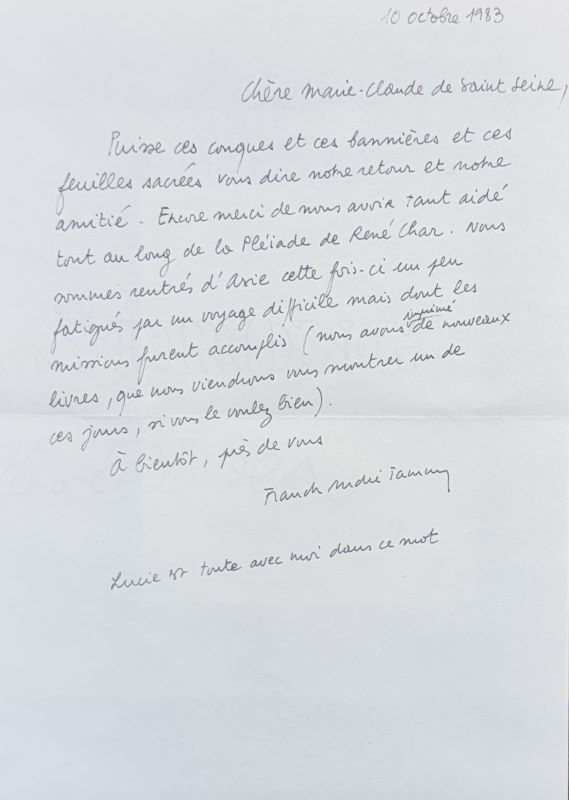 in-8 oblong, broché, 36 pp. Edition originale. Tirage limité à 75 exemplaires sur papier népalais, celui-ci justifié H.C. avec un envoi et une lettre autographe signés de l'auteur à Marie-Claude de Saint Seine, qu'il remercie pour son aide "tout au long de la Pléiade de René Char". Editrice chez Gallimard, Marie-Claude de Saint Seine épousera René Char en 1987. Très bon état. Seller Inventory # 114634