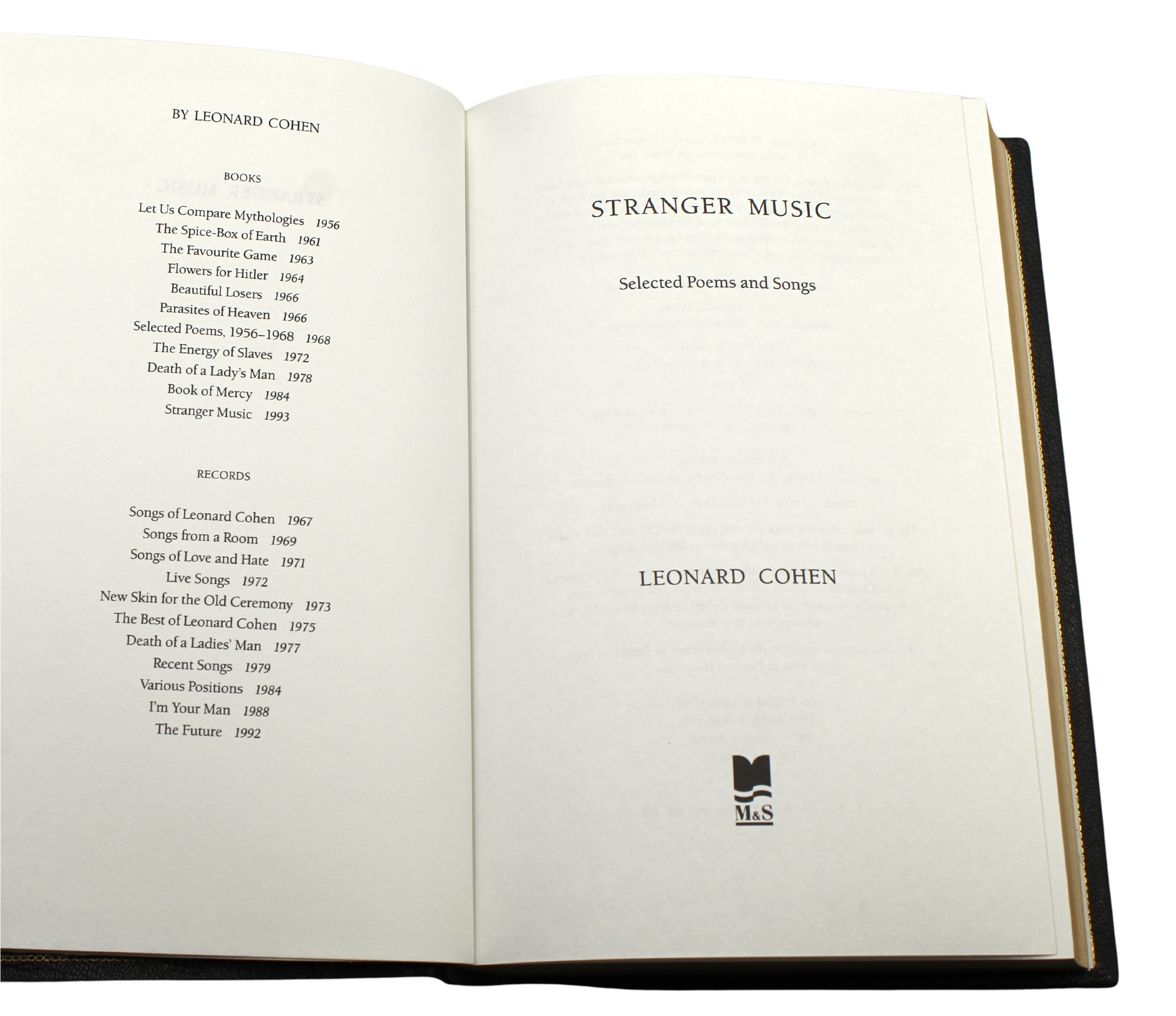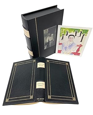 Cohen, Leonard. Stranger Music: Selected Poems and Songs. Toronto: McClellan & Stewart, Inc., 1993. First edition. Rebound with full leather boards, gilt tooling, gilt titles, and raised bands to spine. Paired with "Paris Again" lithographic print, signed by Cohen in ink. Book and print are presented together in a matching custom 1/4 leather and cloth clamshell case. Presented is a first edition printing of Leonard Cohen s Stranger Music. Published in 1993 by McClellan & Stewart in Toronto, the book is presented rebound in full leather boards, with gilt tooling, gilt titles, and raised bands to the spine, and gilt tooled borders to the front and back boards. Stranger Music presents a magnificent cross-section of Cohen's work, including the legendary songs "Suzanne," "Sisters of Mercy," "Bird on a Wire," "Famous Blue Raincoat," "I'm Your Man," and "The Future", paired with selections from his earlier books Flowers for Hitler, Beautiful Losers, and Death of a Lady's Man. It also features eleven previously unpublished poems. Paired with this beautifully bound first edition of Stranger Music is a lithographic print of Paris Again, signed by Leonard Cohen. This collectible pairing demonstrates that Cohen is a writer of intelligence and a creative force who transcends genres. A massive record of the poet's imaginative journey, through beauty, through horror, through the extremes of love and despair, from the deepest abyss of self-abnegation to the rare and necessary moments of ecstasy. The language ranges from the exquisitely beautiful to the darkly obscene, from the romantically inspired to the ironically banal. A poetic record like no other (Toronto Star.) Leonard Cohen s artistic career began in 1956 with the publication of his first book of poetry, Let Us Compare Mythologies. He has published two novels, The Favourite Game and Beautiful Losers, and eleven books of poetry, most recently Stranger Music: Selected Poems and Songs, Book of Longing, and Leonard Cohen: Poems and Songs. He released fourteen studio albums, with his final album, You Want It Darker, released in 2016. Cohen was inducted into the Rock and Roll Hall of Fame in 2008, received a Grammy Lifetime Achievement Award in 2010, and was awarded the Glenn Gould Prize in 2011. This beautiful edition demonstrates the range and depth of Cohen s genius, revealing an extraordinary artistic gift that spans music, the written word, and art. CONDITION: Very good condition. Rebound in full leather boards, with gilt tooling, gilt titles, and raised bands to the spine, and gilt tooled borders to the front and back boards. Paper is healthy, with clean pages without marks or tears. Paired with a color lithographic print of Paris Again, signed by Leonard Cohen in black ink in the bottom right margin. Color is vibrant and the ink signature is legible, without smears or fading. Book and print are presented together in a custom 1/4 leather and cloth clamshell case, with gilt titles and raised bands to the spine, and an inlaid photograph portrait of Leonard Cohen on the front. The lithographic print is held in place by protective corners, on the interior of the clamshell. Accompanied by our company's letter of authenticity.