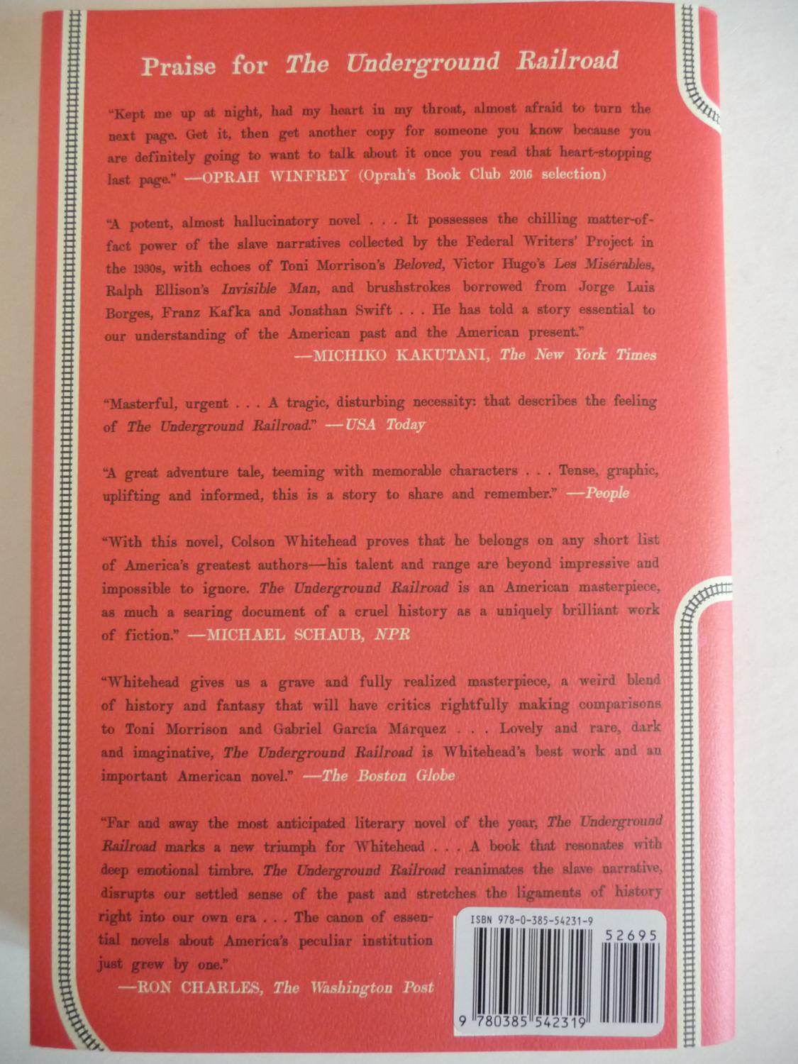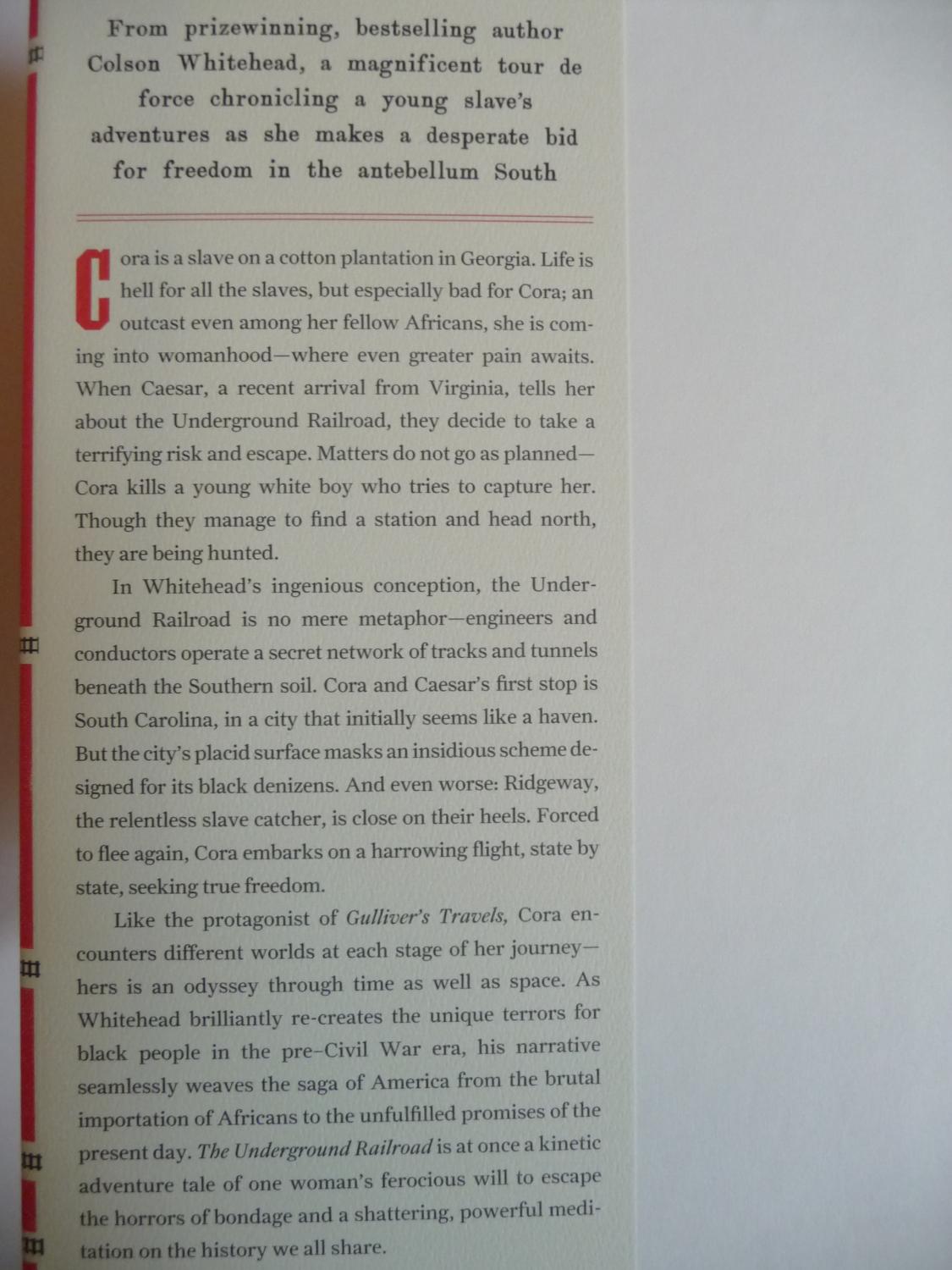 Cora is a slave on a cotton plantation in Georgia. Life is hell for all the slaves, but especially bad for Cora; an outcast even among her fellow Africans, she is coming into womanhood—where even greater pain awaits. When Caesar, a recent arrival from Virginia, tells her about the Underground Railroad, they decide to take a terrifying risk and escape. Matters do not go as planned—Cora kills a young white boy who tries to capture her. Though they manage to find a station and head north, they are being hunted.