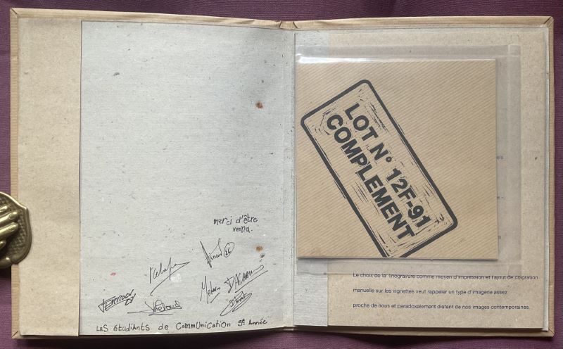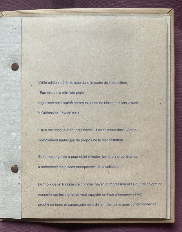 Add to basketÉdition réalisée dans le cadre de l'exposition " Pas nés de la dernière pluie" organisée par l'option communication de l'Institut d'Arts visuels d?Orléans en février 1991. Institut d'Arts Visuels d'Orléans, 1991. 26,5 x 21,5 cm, 28 pp. Broché sous cartonnage d'édition imprimé, avec un complément sous blister non ouvert. Nombreuses illustrations en linogravure. Bon exemplaire. Tirage limité à 60 exemplaires. Exemplaire signé par les 7 étudiants ayant réalisé cet ouvrage.